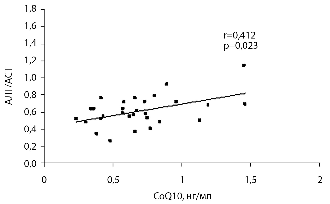 Рисунок 2. Корреляционные взаимосвязи между коэнзимом Q10 и отношением АЛТ/АСТ в контрольной группе.