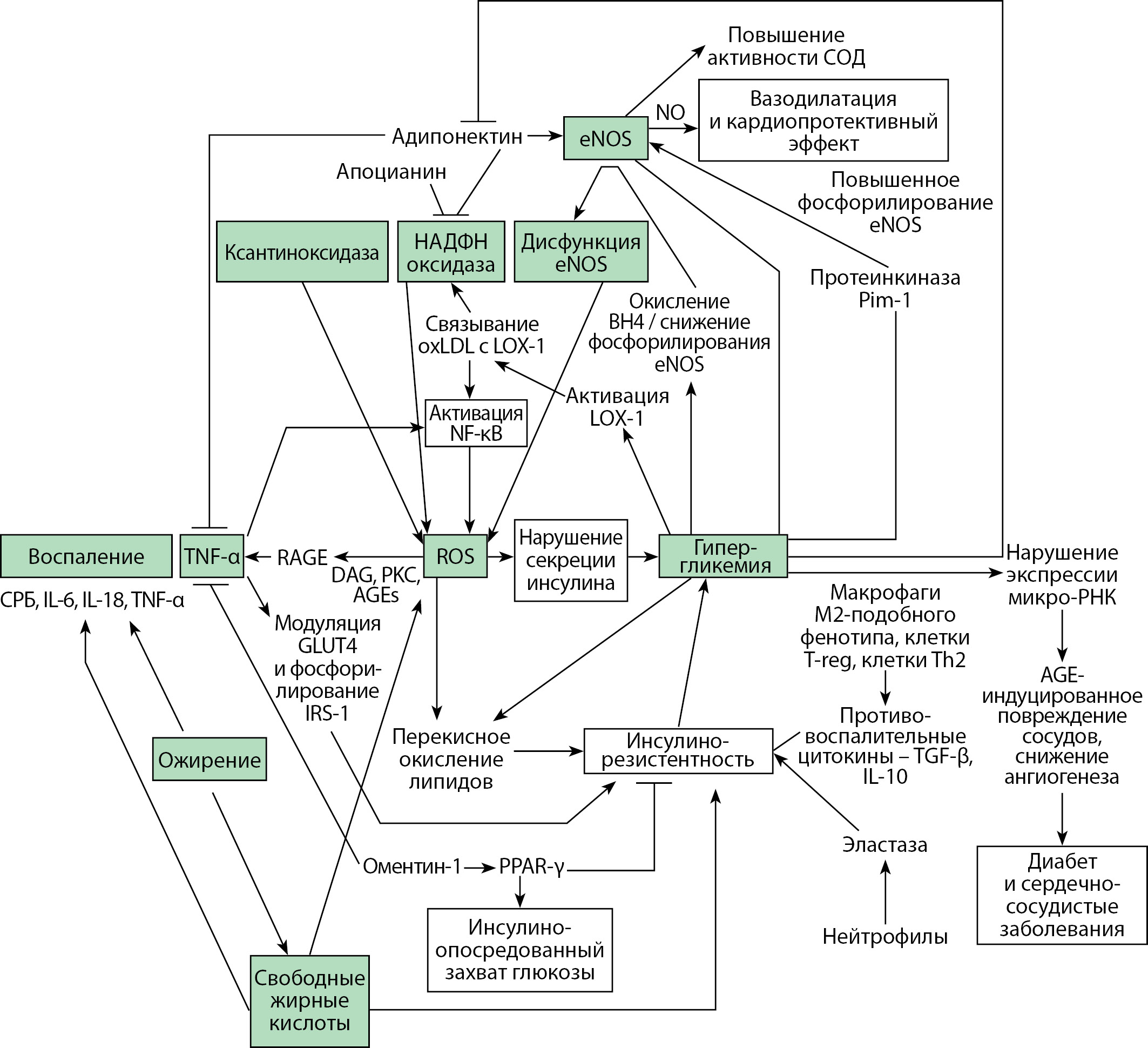 Примечание: СОД — супероксиддисмутаза; eNOS — эндотелиальная синтаза оксида азота; НАДФН-оксидаза — никотинамидадениндинуклеотидфосфат-оксидаза; LOX-1 — лектиноподобный рецептор; oxLDL — окисленные липопротеины низкой плотности; TNF-α — фактор некроза опухоли-α; AGEs — конечные продукты глубокого гликирования; RAGE — рецепторы AGE; DAG — диацил-глицерол; PKC — протеинкиназа С; IL — интерлейкин; СРБ — С-реактивный белок; GLUT4 — инсулинзависимый белок-переносчик глюкозы-4; IRS-1 — инсулиновый рецептор-1; PPAR-γ — рецепторы, активируемые пероксисомными пролифераторами; TGF-β — трансформирующий фактор роста-β.