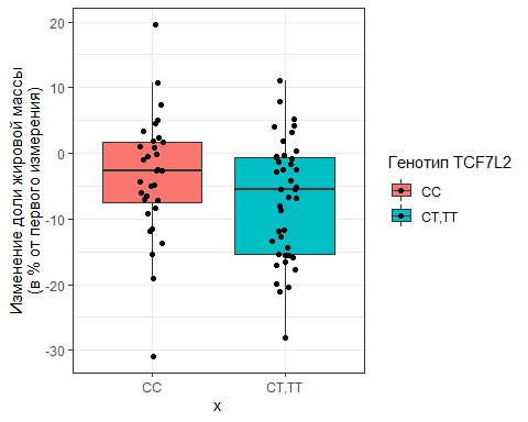 Рисунок 1. Ассоциация rs7903146 TCF7L2 с изменением доли жировой массы тела при соблюдении диетотерапии.