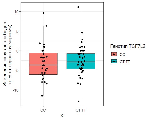 Рисунок 2. Ассоциация rs7903146 TCF7L2 с изменением окружности бедер у пациентов, принимавших метформин на фоне диетотерапии.