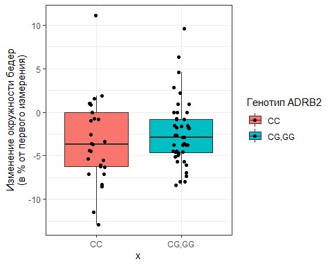6. Рисунок 6. Влияние генотипа ADRB2 на изменение окружности бедер у пациентов, принимавших метформин на фоне диетотерапии | |