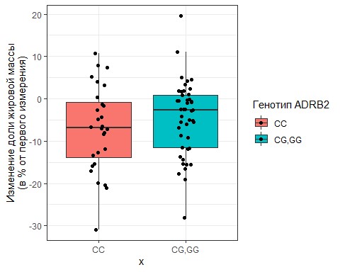 4. Рисунок 4. Влияние гена ADRB2 на изменение доли жировой массы тела у пациентов, принимавших метформин на фоне диетотерапии | |