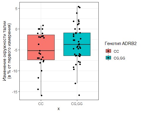 Полиморфный маркер rs1042714 ADRB2 не влиял на изменение состава тела в группе диетотерапии (табл. 4). Группа пациентов, принимавших метформин на фоне диеты, продемонстрировала более эффективное уменьшение ОБ у гомозиготных носителей аллеля С по сравнению с носителями генотипов CG и GG (табл. 5, рис. 3). Пациенты данной группы, являющиеся гомозиготными по аллелю С rs1042714 ADRB2, в целом характеризовались тенденцией к снижению доли жировой массы организма (-8,28±8,86% против -3,20±5,09%; p=0,068), а также уменьшению ОТ (-5,91±4,29% против -3,03±4,01%; p=0,091) по сравнению с носителями аллеля G (табл. 5, рис. 4, 5).