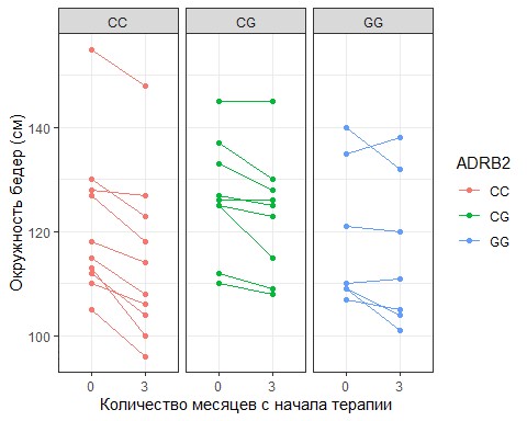 3. Рисунок 3. Влияние гена ADRB2 на изменение окружности бедер у пациентов, принимавших метформин на фоне диетотерапии | |