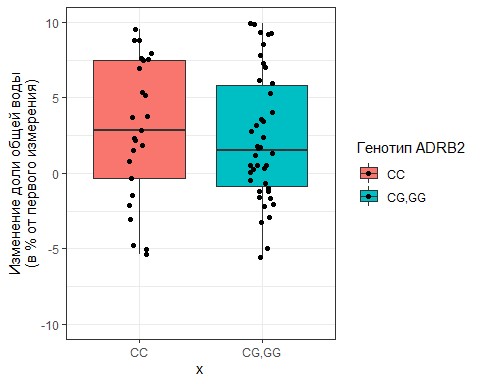 7. Рисунок 7. Влияние гена ADRB2 на изменение доли общей воды у пациентов, принимавших метформин на фоне диетотерапии | |