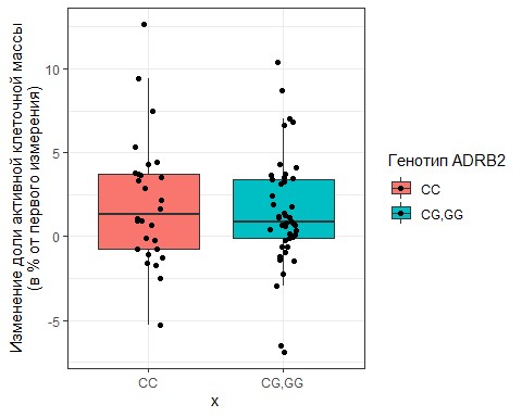 8. Рисунок 8. Влияние гена ADRB2 на изменение доли активной клеточной массы у пациентов, принимавших метформин на фоне диетотерапии | |