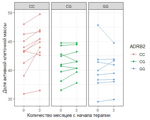 9. Рисунок 9. Влияние генотипа ADRB2 на изменение доли активной клеточной массы у пациентов, принимавших метформин на фоне диетотерапии | |