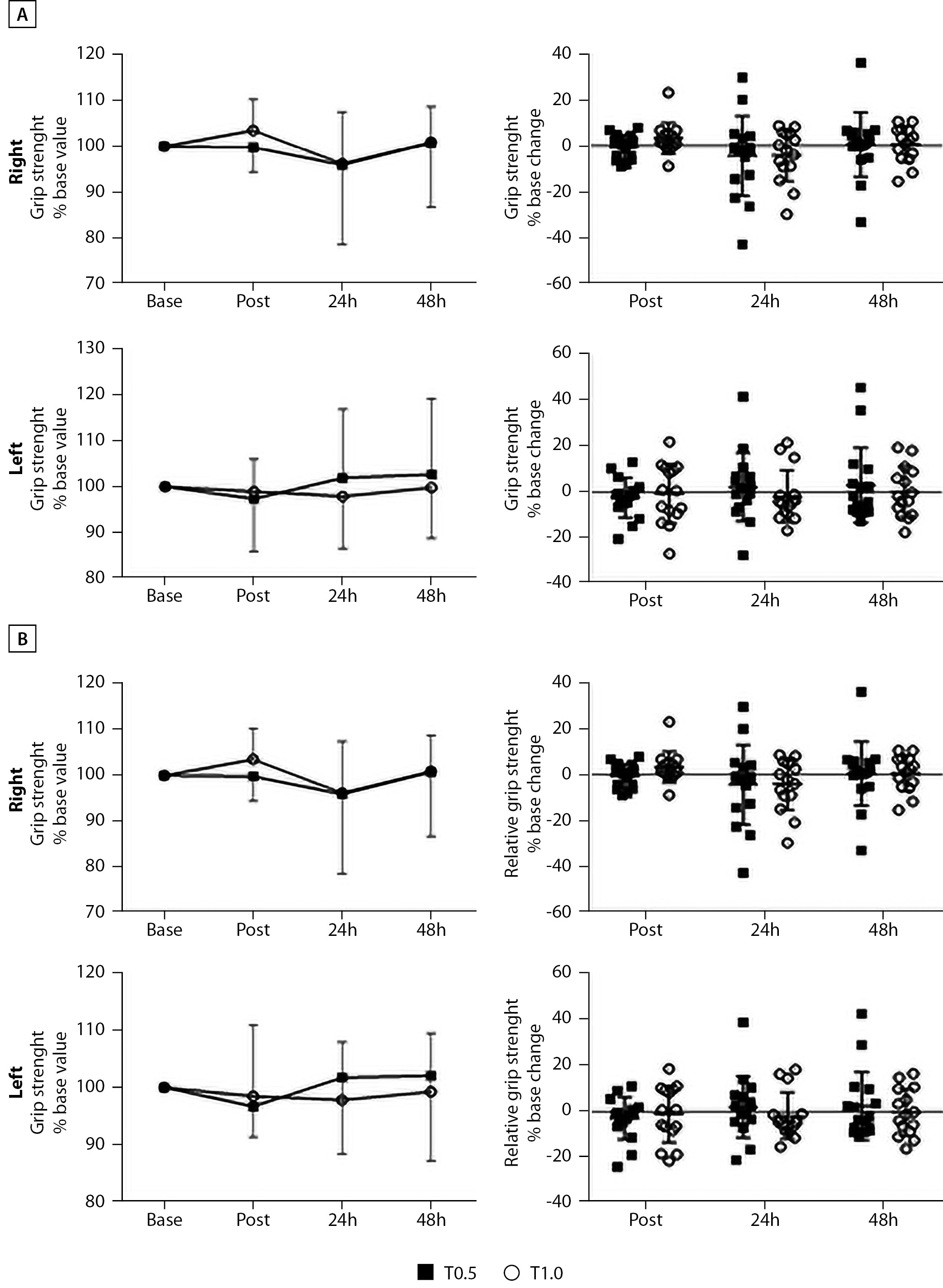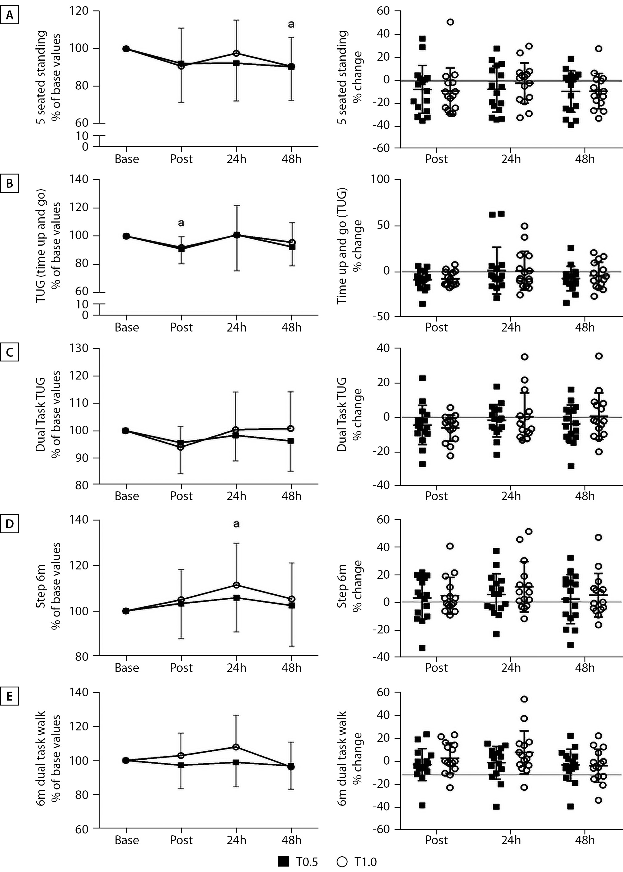 RESULTS: The final results of the intra-class correlation coefficient measurements for a set of tests showed strong reliability among members of each examined group. For the handgrip strength tests of the right and left hands, the results were 0.850 and 0.892, respectively. For the squat jump and countermovement jump tests, the results were 0.966 and 0.932, respectively. The results were 0.896 and 0.945 for walking 6 meters with or without double tasks. Finally, for the TUG and TUP-DT tests, the results were 0.520 and 0.663, respectively. After analyzing and interpreting the data for the functional capacity tests, the following results were obtained: For the 5 sit-stand test, the result was (F (3.87)=4.22; p=0.008, ηp2=0.127). For the Time up and go test, the result was (F (3.87)=4.56; p=0.019, ηp2=0.136), and for the 6 m walk, the result was (F (3.87)=3.81; p=0.013, ηp2=0.116). Finally, the 5X sit-to-stand test at 48 hours was lower than the base value (p=0.024), while the TUG immediately after the post was lower than the base value.