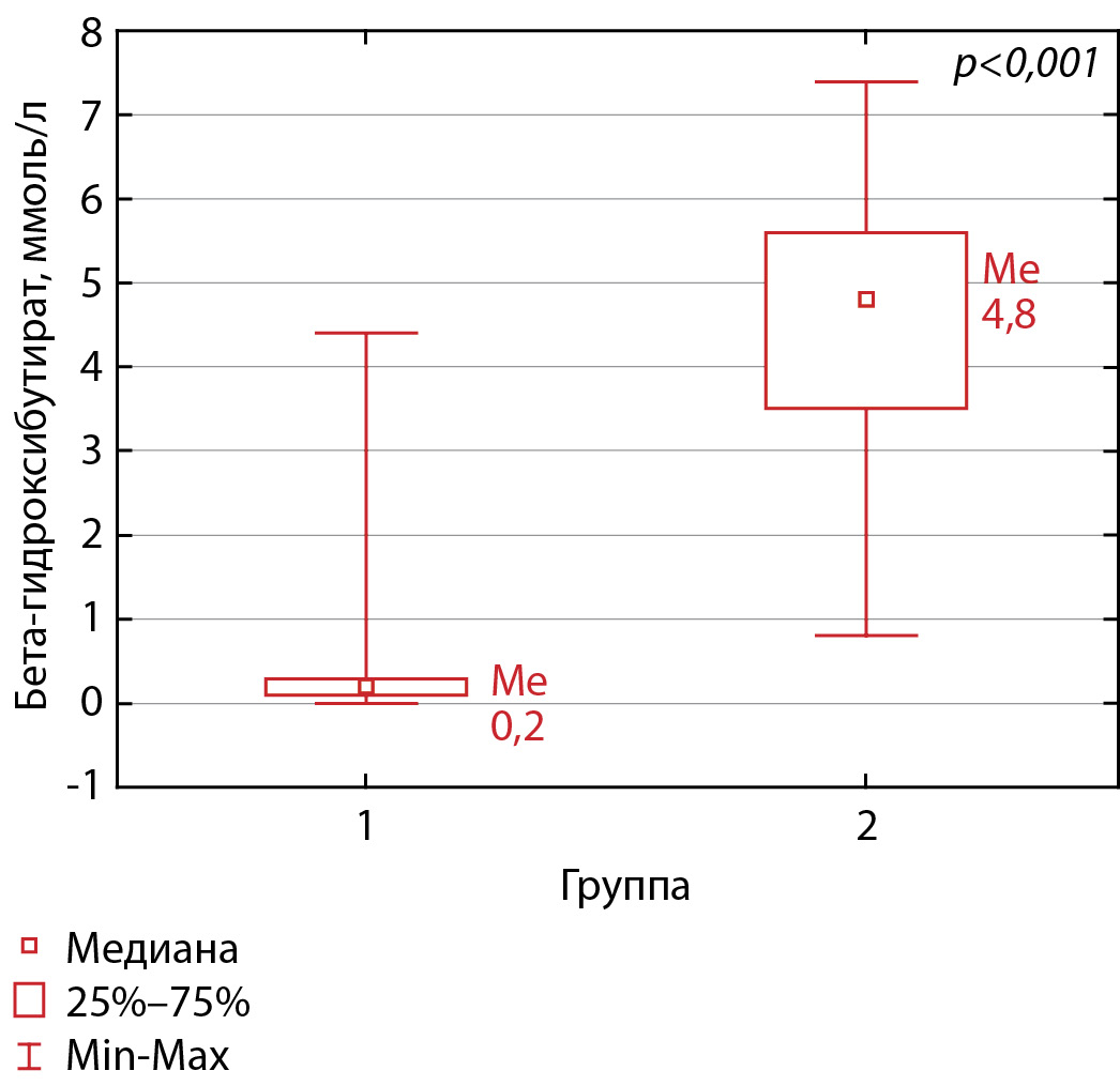 Также высокий уровень БГБ на фоне гипогликемии описан у пациентов с рецидивом эндогенного гиперинсулинизма после парциальной панкреатэктомии, что, наиболее вероятно, обусловлено снижением инсулинемии и, соответственно, ингибирующего действия на кетогенез [15]. Однако необходимо отметить, что в нашем исследовании у всех пациентов с рецидивом инсулиномы после резекции поджелудочной железы отмечалась супрессия БГБ.