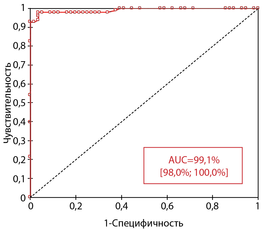 Статистическая обработка полученных результатов проводилась с помощью стандартных методов статистического анализа с использованием программного обеспечения: Statistica 10 (StatSoft Inc., США). Для количественных признаков указаны медиана и интерквартильный интервал, а также минимальное и максимальное значение (в отношении отдельных параметров). Для выявления связи между параметрами определялся коэффициент корреляции Спирмена. С целью сравнения количественных данных двух независимых выборок применялся однофакторный дисперсионный анализ (при нормальном распределении признака) или критерий Манна–Уитни (при распределении, отличном от нормального), качественных признаков — тест Хи-квадрат. ROC-анализ осуществлялся с использованием программного обеспечения Microsoft Excel XLSTAT. Различия принимались как статистически значимые при р<0,05.