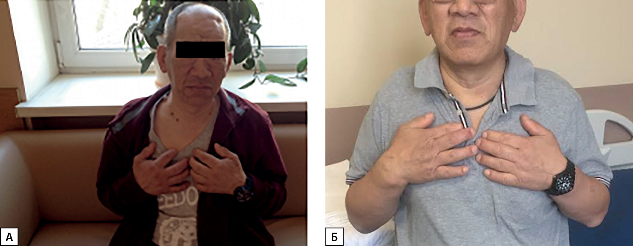 В 2015 г. впервые госпитализирован в ФГБУ «НМИЦ эндокринологии» Минздрава России (рис. 1А). По результатам лабораторных исследований: СТГ — 80,0 нг/мл, ИФР-1 — 497,5 нг/мл. На МРТ гипофиза с контрастным усилением — аденома спрорастанием в основную пазуху, занимающая почти весь ее объем. В связи с отрицательной динамикой роста новообразования и отсутствием биохимической ремиссии акромегалии проведена повторная аденомэктомия (трансназальным транссфеноидальным доступом). Послеоперационный период протекал без осложнений. Однако уровень СТГ и ИФР-1 нормализовать не удалось. При выписке рекомендована терапия аналогами соматостатина длительного действия в максимальной дозе.