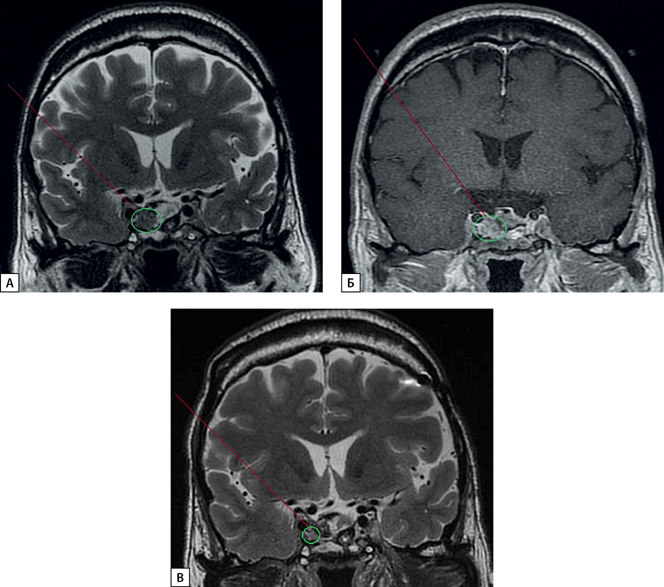 С января 2020 г. пациент стал отмечать выраженное ухудшение общего состояния в виде частой интенсивной головной боли, не купируемой приемом НПВС, прогрессирующего снижения остроты зрения, прибавки массы тела, декомпенсации сахарного диабета, требующей увеличения доз инсулина. По данным обследования: ИФР-1–332 нг/мл (выше нормы), гликированный гемоглобин — 8,4%, по МРТ гипофиза — остаточная ткань аденомы размерами 14×17×14 мм с параселлярным распространением вправо, Knosp IV) (рис. 2 А, Б). С учетом особенностей течения заболевания в ФГБУ «НМИЦ эндокринологии» Минздрава России принято решение о необходимости инициации терапии препаратом из группы антагонистов рецепторов гормона роста — пэгвисомантом (10 мг 1 р/сут п/к). Через 6 мес по данным контрольного обследования наблюдалась положительная клиническая и лабораторная динамика: уменьшение отечности мягких тканей, значительное снижение частоты и интенсивности головной боли, улучшение общего состояния, повышение чувствительности к инсулину, нормализация ИФР-1 — 162 нг/мл. В связи с отсутствием продолженного роста аденомы гипофиза с декабря 2020 г. терапия аналогами соматостатина отменена.