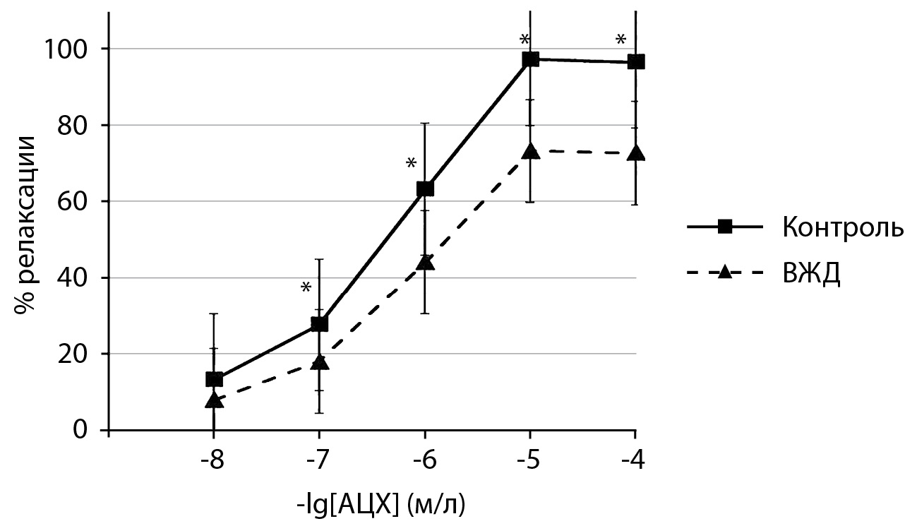 В ходе исследования реактивности сосудов на фоне предварительного сокращения фенилэфрином наблюдалось снижение дилатации у опытных крыс при действии АЦХ во всем использованном диапазоне концентраций (от 10-8 до 10-4 М/л) (рис. 3).
