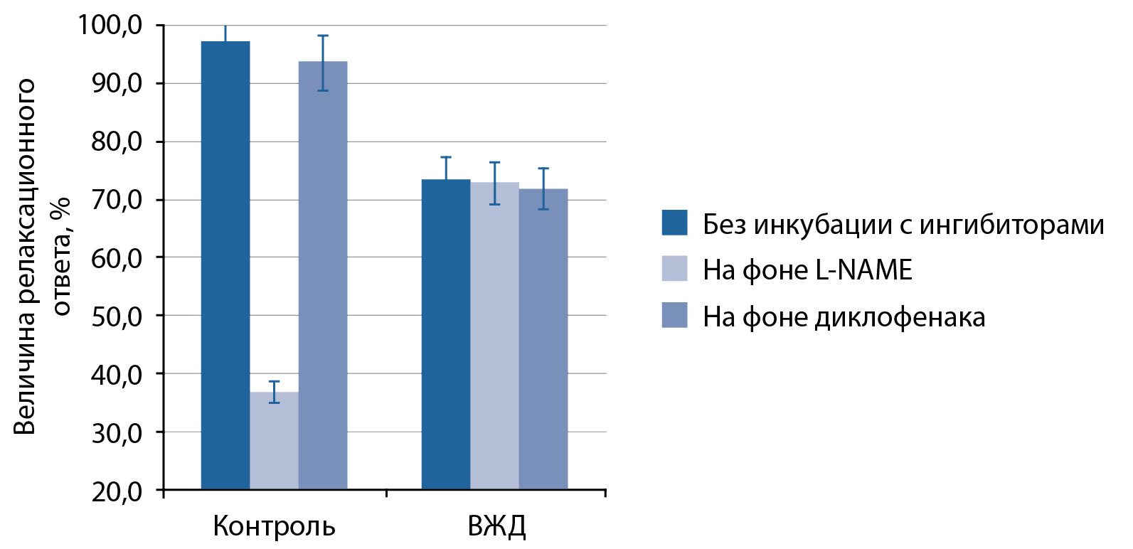 С целью исследования механизма вазорелаксационных ответов была проведена предварительная инкубация препаратов с ингибитором эндотелиальной NO-синтазы (eNOS) — L-NAME и с ингибитором циклооксигеназы — диклофенаком. Об изменении величины релаксационного ответа судили по изменению диаметра сосуда на действие АЦХ до инкубации и после отмывания и 20-минутной инкубации с ингибитором. Введение L-NAME приводило к значительному ослаблению релаксации уживотных, находящихся на стандартной диете, и слабо влияло на АЦХ-опосредованную вазодилатацию в артериях крыс, находящихся на ВЖД. В то же время влияние диклофенака не было выражено ни в контрольной, ни в опытной группе (рис. 4).