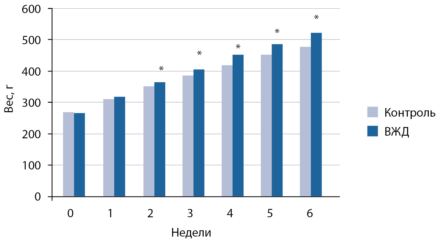 Выборки контрольных и опытных крыс достоверно не различались по начальной массе (табл. 1). Животные, содержащиеся на ВЖД, начиная с 2-й недели диеты имели более высокую прибавку в весе (рис. 1) и к концу 6-й недели (табл. 1 — окончание диеты) более высокую массу тела по сравнению с контролем (p=0,001).