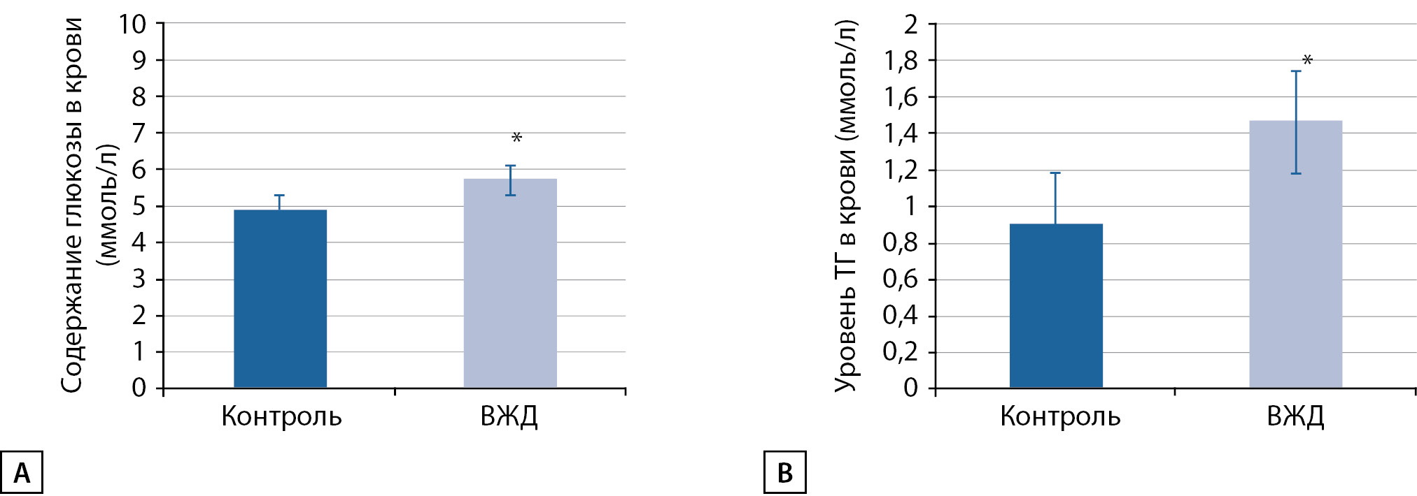 2. Рис. 2. Показатели крови: А — уровень глюкозы (натощак) (n=6); В — уровень триглицеридов в цельной крови (n=5)