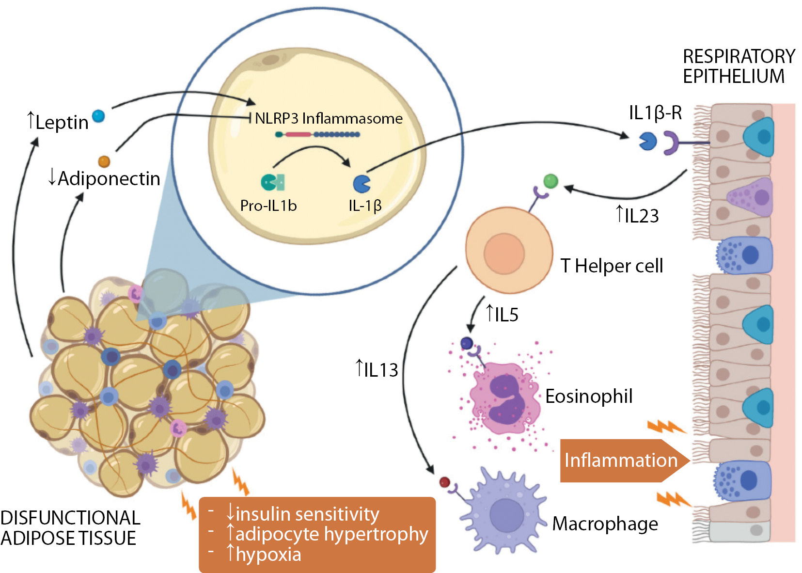 Рисунок 1. Перекрестные взаимодействия между дисфункциональной жировой тканью и респираторным эпителием в легких. Инсулинорезистентность, гипертрофия адипоцитов и гипоксия изменяют секрецию адипокинов дисфункциональной жировой ткани, способствуя активации воспалительных процессов [22].