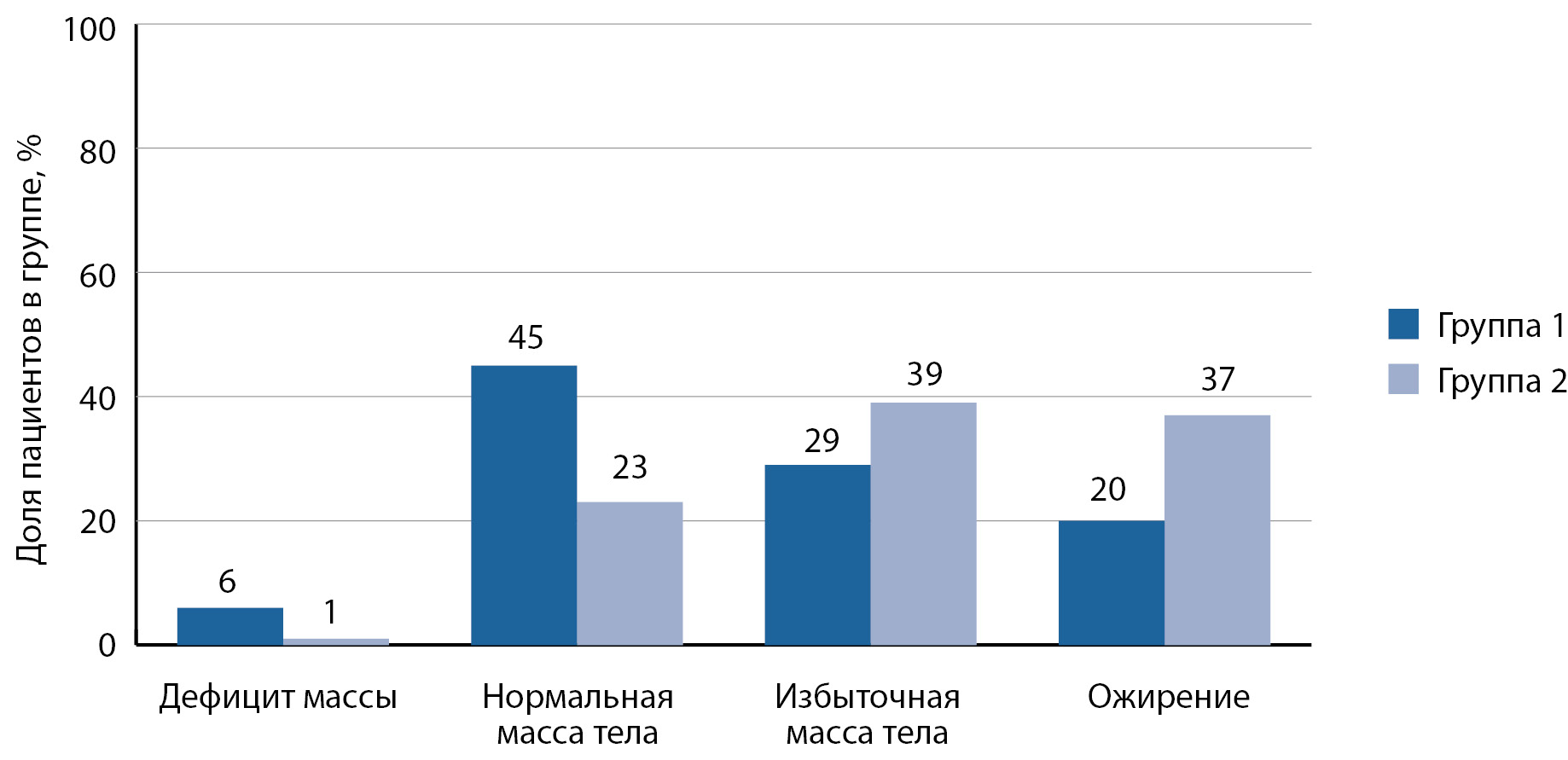 Масса тела измерялась при помощи электронных напольных медицинских весов (ВЭМ-150, Масса-К, Россия), рост — с помощью медицинского ростомера (Р-Сс-МСК МСК-233, ООО «Медстальконструкция», Россия). ИМТ рассчитывался поформуле: ИМТ (кг/м²)=масса тела натощак (кг)/рост22). Оценка массы тела пациентов проводилась согласно классификации Всемирной организации здравоохранения.
