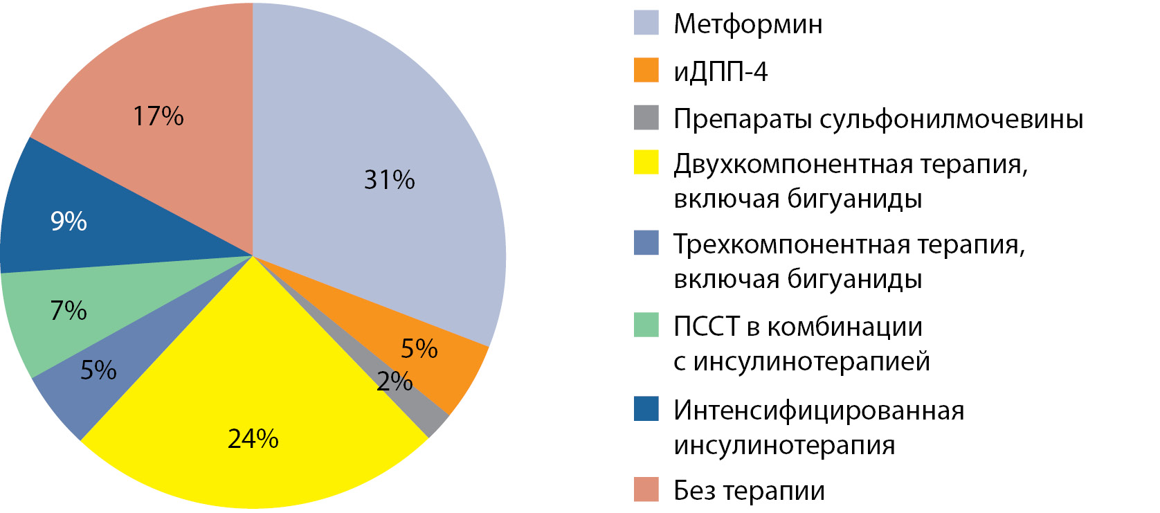 2. Рисунок 2. Сахароснижающая терапия у пациентов с первичным гиперпаратиреозом и сопутствующим сахарным диабетом (человек): метформин — 13; ингибиторы дипептидилпептидазы-4 (иДДП-4) — 2; комбинация метформин + иДДП-4 — 5; комбинация метформин + агонист рецепторов ГПП-1 — 1; комбинация метформин + ингибитор натрий-глюкозного котранспортера-2 (иНГЛТ2) — 2; препараты сульфонилмочевины — 1; комбинация метформин + препарат сульфонилмочевины — 2; комбинация метформин + препарат сульфонилмочевины + иНГЛТ2 — 1; комбинация метформин + препарат сульфонилмочевины + инсулин пролонгированного действия — 1; комбинация метформин + иНГЛТ2 + инсулин короткого/ультракороткого действия — 2; интенсифицированная инсулинотерапия — 4. ПССТ — пероральная сахароснижающая терапия.