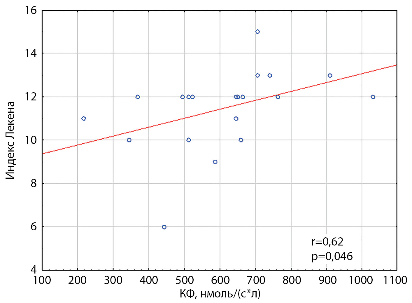 1. Рисунок 1. Корреляционный анализ индекса Лекена и уровня кислой фосфатазы (КФ) у больных с метаболическим фенотипом ОА (группы К и О)