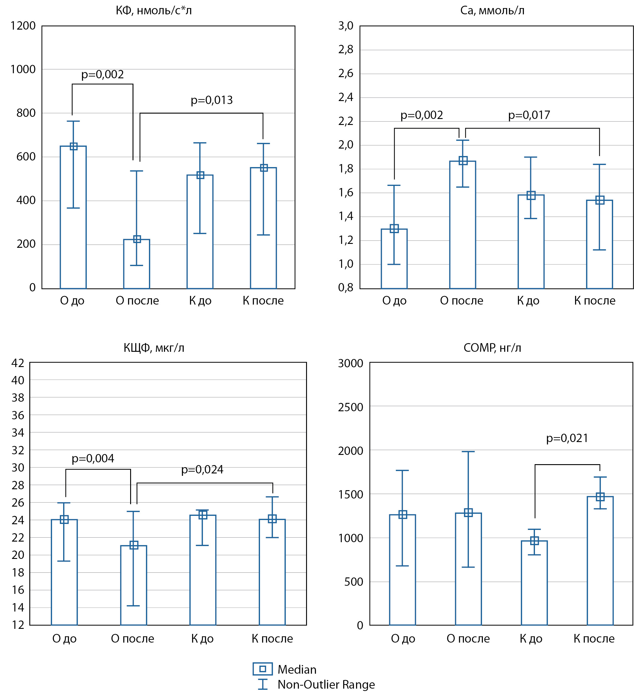 В начале исследования и после 30 дней консервативной терапии определяли маркеры костно-хрящевого метаболизма. Биохимические показатели определялись в сыворотке крови. Образцы крови были собраны после ночного голодания от всех участников. Образцы венозной крови были центрифугированы при 3000 g в течение 15 минут. После отбора пробы хранили замороженными при −20°C до испытания. Образцы сыворотки не хранились более 2 мес и размораживались при комнатной температуре. Хрящевой олигоматриксный пептид (COMP) измеряли методом ИФА с помощью набора COMP EIA (Immunodiagnostic systems (IDS), Maryland, U.S.A). Анализ представляет собой твердофазный иммуноферментный анализ моноклональных антител. Образцы, содержащие хрящевой олигоматриксный пептид, реагируют с раствором, содержащим меченное биотином специфичное моноклональное антитело. Реакция протекает в пластиковых лунках (твердая фаза), покрытых стрептавидином и заключенных в пластиковую рамку. После образования комплекса антиген/антитело микропланшет промывают для удаления несвязанных антигенов, а затем инкубируют с ферментным субстратом. Величину субстрата определяют колориметрически, измеряя поглощение остановленной реакции при длине волны 450 нм в ридере для микропланшетов. Поглощение пропорционально концентрации хрящевого олигоматриксного пептида в исследуемом образце. Костный изофермент щелочной фосфатазы (КЩФ) определяли методом ИФА с помощью набора Ostase BAP EIA (Immunodiagnosticsystems (IDS), Maryland, U.S.A). Анализ представляет собой твердофазный иммуноферментный анализ ­моноклональных антител. Образцы, содержащие КЩФ, реагируют с раствором, содержащим меченное биотином специфичное моноклональное антитело. Реакция протекает в пластиковых лунках (твердая фаза), покрытых стрептавидином и заключенных в пластиковую рамку. После образования комплекса антиген/антитело микропланшет промывают для удаления несвязанных антигенов, а затем инкубируют с ферментным субстратом. Величину субстрата определяют колориметрически, измеряя поглощение остановленной реакции при длине волны 450 нм. в ридере для микропланшетов. Поглощение пропорционально концентрации КЩФ в исследуемом образце. Активность кислой фосфатазы (КФ) в образцах измеряли унифицированным методом по «конечной точке», основанным на количественном определении продукта ферментативного расщепления п-нитрофенилфосфата — п-нитрофенола (коммерческий набор «Витал Диагностикс»). Кальций (Са) измеряли спектрофотометрическим методом с использованием набора реагентов для определения кальция в биологических жидкостях с о-крезолфталеинкомплексоном («Агат», Россия). Пациентам было предложено ответить на вопросы клинических шкал по оценке качества сна (шкала Эпворта, Левина, Питсбургский опросник качества сна (PSQI)), функционального состояния суставов (KOOS, ­Лекен) и качества жизни (SF-36).