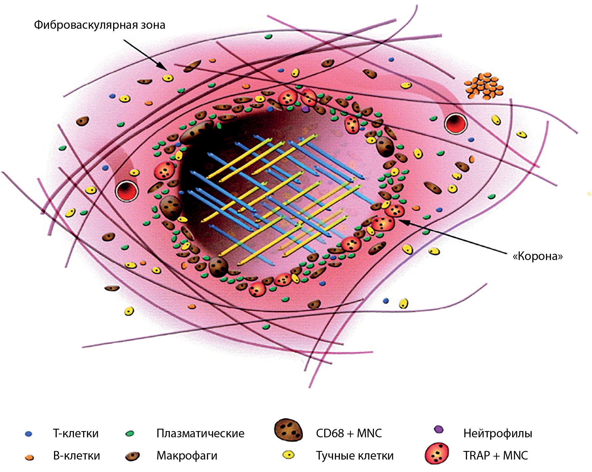 Рисунок 1. Клеточная модель подагрического тофуса (адаптировано из Dalbeth N. и соавт., 2010) [52]. Клетки идентифицированы при помощи количественной иммуногистохимии (MNC — мононуклеарные клетки; TRAP — клетки, устойчивые к тартрату и кислой фосфатазе).