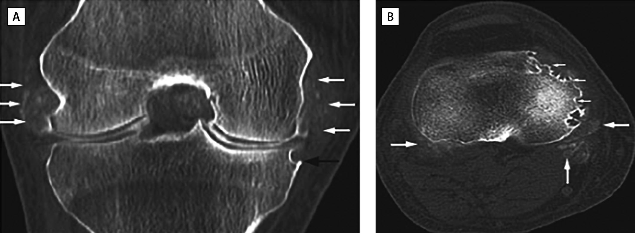 (A) Тофусные отложения (белые стрелки) в коленном суставе, прилегающие к медиальной и латеральной коллатеральным связкам и межмыщелковой вырезке. Выраженная эрозия на медиальном мыщелке большеберцовой кости (черная стрелка).