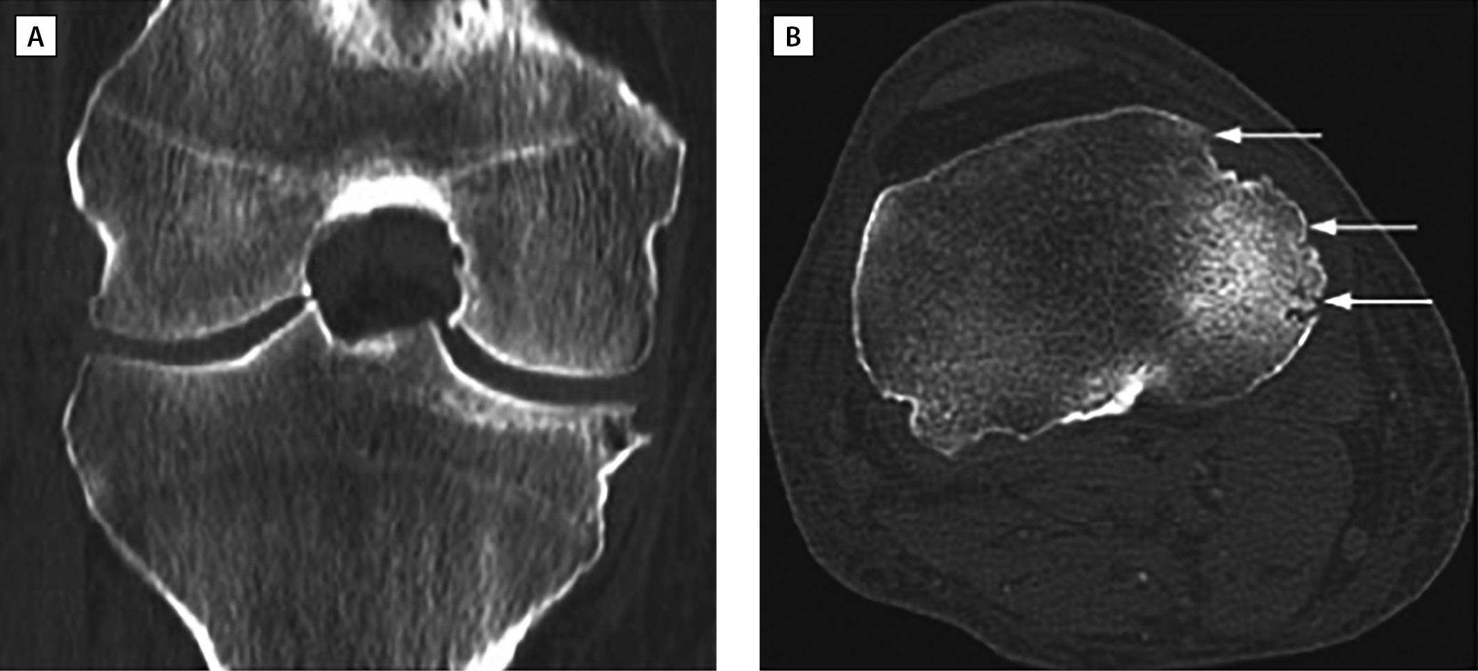 (B) Tophi deposits along the medial and lateral sides of the knee joint (large arrows) and erosion of the tibial condyle (small arrows).