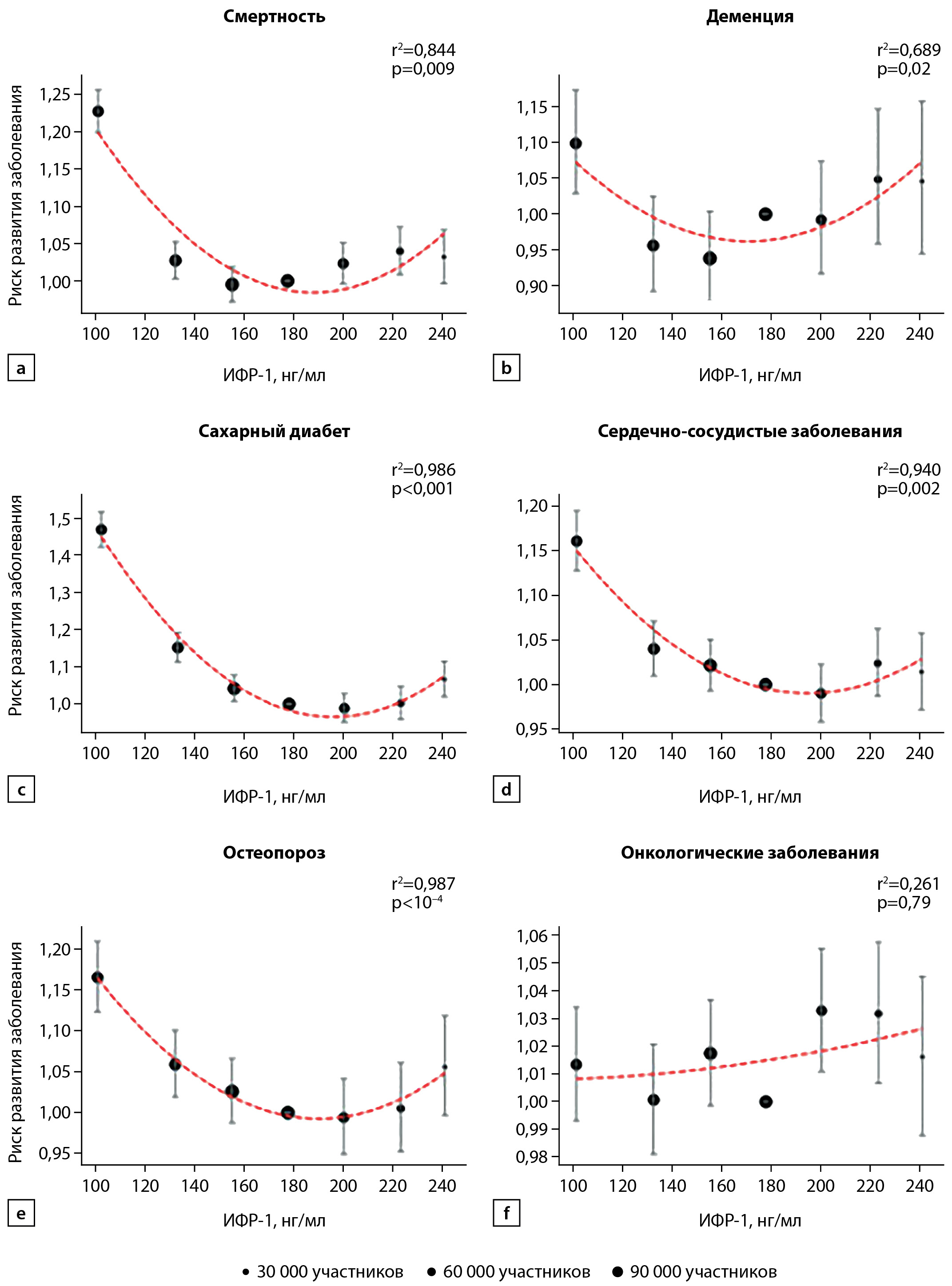 При анализе результатов были установлены следующие закономерности: риски возникновения заболеваний ассоциированы с уровнем ИФР-1 в соответствии с принципом антагонистической плейотропии — как высокие, так и низкие уровни ИФР-1 могут менять риски одного и того же исхода. Таким образом, была установлена U-образная связь между уровнями ИФР-1 и сахарным диабетом, деменцией, сердечно-сосудистыми заболеваниями, остеопорозом. Тем не менее для онкологических заболеваний не была установлена U-образная связь с концентрацией ИФР-1 [4]. Схожие результаты были получены и при метаанализе 19 исследований по оценке корреляции риска общей смертности и уровней ИФР-1. Как низкие, так и высокие значения ИФР-1 были ассоциированы с повышенным уровнем общей смертности (исследование Rahmani J. и соавт., 2022) [5]. В то время как в некоторых исследованиях была установлена связь только для низких уровней ИФР-1 и общей смертности, смертности от сердечно-сосудистых заболеваний, например в проспективном исследовании Rancho Bernardo Study [6].