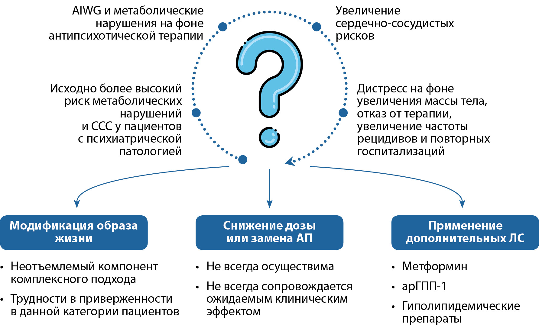 Увеличение массы тела и метаболические нарушения, ассоциированные с приемом АП, — серьезная клиническая проблема, требующая тесного междисциплинарного взаимодействия психиатра и специалиста, готового к наблюдению пациента сточки зрения соматического здоровья (эндокринолога, терапевта, кардиолога). Изменение образа жизни является наиболее безопасным, но, к сожалению, в ряде случаев недостаточно эффективным вмешательством, в связи с чем для коррекции метаболических последствий рассматриваются коррекция основной антипсихотической терапии или назначение дополнительных лекарственных средств (метформина, АР ГПП-1 и гиполипидемических препаратов). Необходимо дальнейшее изучение эффективности этих и других классов препаратов, в т.ч. для профилактики метаболических нарушений в группах высокого риска.