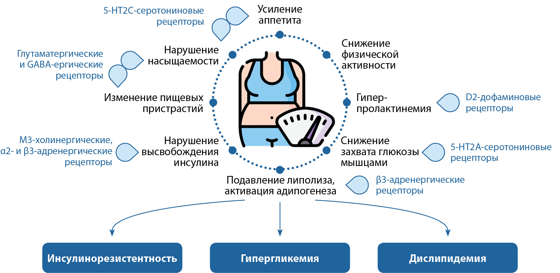 По ряду причин для данной категории пациентов AIWG следует расценивать как крайне нежелательный побочный эффект. AIWG способствует развитию метаболических нарушений (дислипидемии и нарушениям углеводного обмена), которые, в свою очередь, повышают сердечно-сосудистые риски [21]. В механизме возникновения AIWG играют роль усиление аппетита, изменение пищевых пристрастий в пользу более калорийной пищи, снижение чувствительности к инсулину, подавление липолиза, снижение физической активности, ятрогенная гиперпролактинемия (ГП) (рис. 1) [22]. Хотя многое в механизме формирования AIWG остается неясным, считается, что ключевую роль играет тропность отдельных АП к серотониновым 5-HT2C-рецепторам [23][24], что объясняет различия в рисках развития метаболических нарушений между отдельными представителями АП (табл. 1): наиболее часто к AIWG приводит прием клозапина и оланзапина [18]. Предполагается, что клозапин и оланзапин способны оказывать прямое действие на нейроны гипоталамуса, содержащие нейропептид Y, который влияет на уровень лептина в контроле пищевого поведения [23]. Наиболее нейтральным эффектом в отношении массы тела обладают арипипразол, луразидон, зипразидон и кветиапин [21][23].