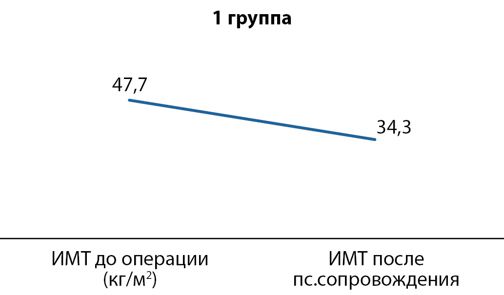 Как показано на рис. 3, средний исходный ИМТ пациентов 2-й группы до хирургического вмешательства составлял 48,6 кг/м2. Спустя 6 мес и более, после хирургического вмешательства, в момент обращения за психологической помощью у пациентов отмечалась остановка или тенденция к набору веса и возврат эпизодов переедания, при этом средний ИМТ составлял 38,7 кг/м2. В период проводимых мероприятий по психологической адаптации к физиологическим и психологическим изменениям в послеоперационный период во 2-й группе удалось достичь стабильного снижения массы тела — средний ИМТ составил 36 кг/м2.