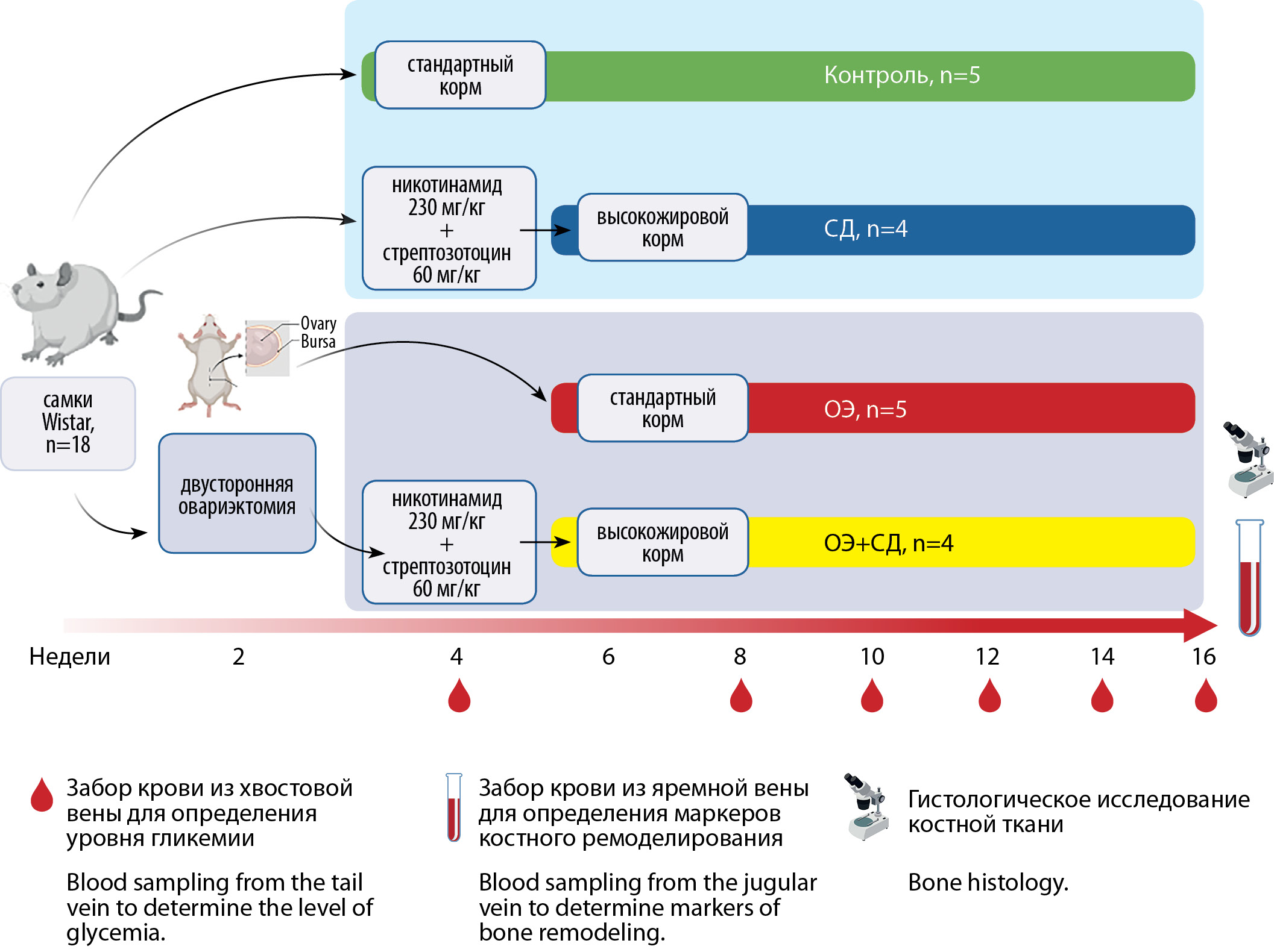 Обоснование. Остеопороз — хроническое метаболическое заболевание скелета, характеризующееся высокой частотой низкотравматичных переломов вследствие снижения плотности костной ткани и нарушения ее микроархитектоники. Постменопаузальный остеопороз занимает около 80% в структуре остеопороза у женщин после 50 лет. Сахарный диабет (СД) не только является фактором риска низкотравматичных переломов, но и ухудшает репаративные процессы в костной ткани. Встречаемость и СД 2 типа, и остеопороза возрастает в период менопаузы, поэтому изучение костного обмена в условиях экспериментального СД и менопаузы без вмешательства внешних факторов представляется важным.