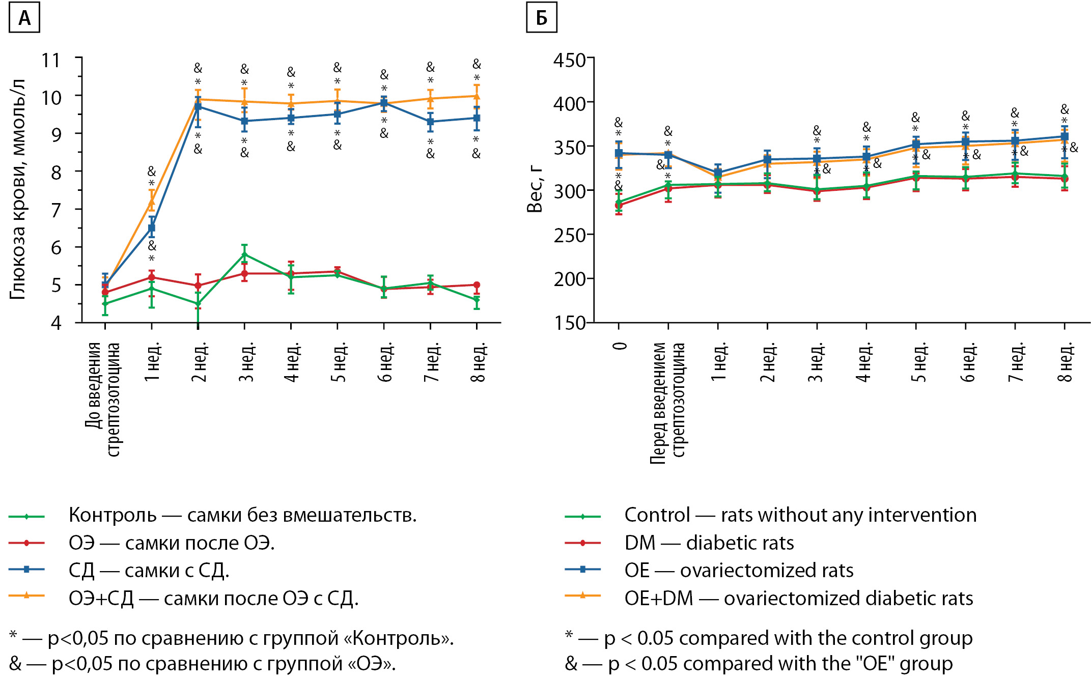 Получены следующие группы: «Контроль» (самки без каких-либо вмешательств, получавшие стандартный корм, n=5), «ОЭ» (самки после ОЭ, получавшие стандартный корм, n=5), «CД» (самки с СД, получавшие высокожировой корм, n=4), «ОЭ+CД» (самки после ОЭ с СД, получавшие высокожировой корм, n=4). У животных без СД гликемию измеряли на 4, 8, 10, 12, 14 и 16-й неделе исследования, в группах с СД2 — на 2-й и 3-й день после введения стрептозотоцина, далее — в конце 8, 10, 12, 14 и 16-й недели эксперимента. Измерение гликемии проводилось не натощак. Наблюдение за животными продолжалось еще 8 нед, суммарная длительность опыта — 16 нед.