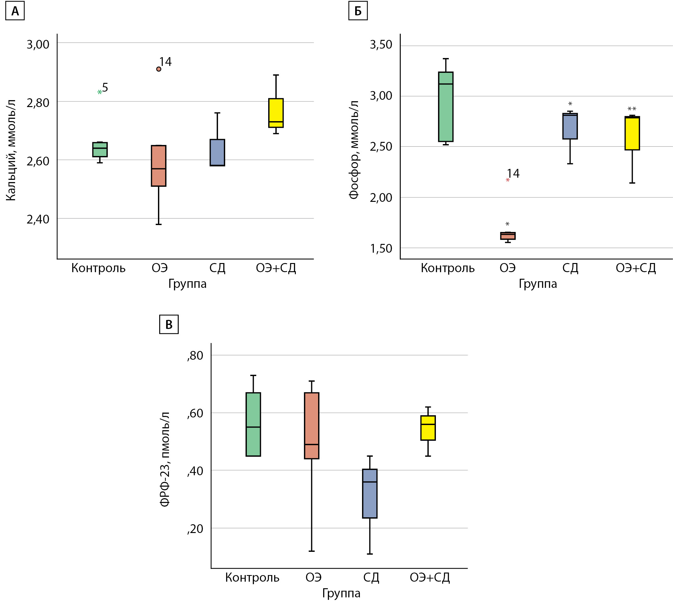 Достоверных отличий в концентрации общего кальция между группами не было. Уровень фосфора был значимо ниже как в группе «ОЭ» (1,63 [ 1,58; 1,65] ммоль/л), так и в группе «СД» (2,81 [ 2,57; 2,83] ммоль/л) по сравнению с группой «Контроль» (3,12 [ 2,55; 3,24] ммоль/л), р<0,001 и р=0,014 соответственно. Однако данный показатель был значимо выше в группе «ОЭ+СД» (2,79 [ 2,46; 2,81] ммоль/л) по сравнению с группой «ОЭ» (2,79 [ 2,46; 2,81] ммоль/л), р=0,025. Корреляции между концентрацией фосфора и показателем гликемии (а также между уровнем кальция и уровнем глюкозы) найдено не было. Стоит отметить, что изменение уровня фосфора не сопровождалось изменением концентрации ФРФ-23 (рис. 3).