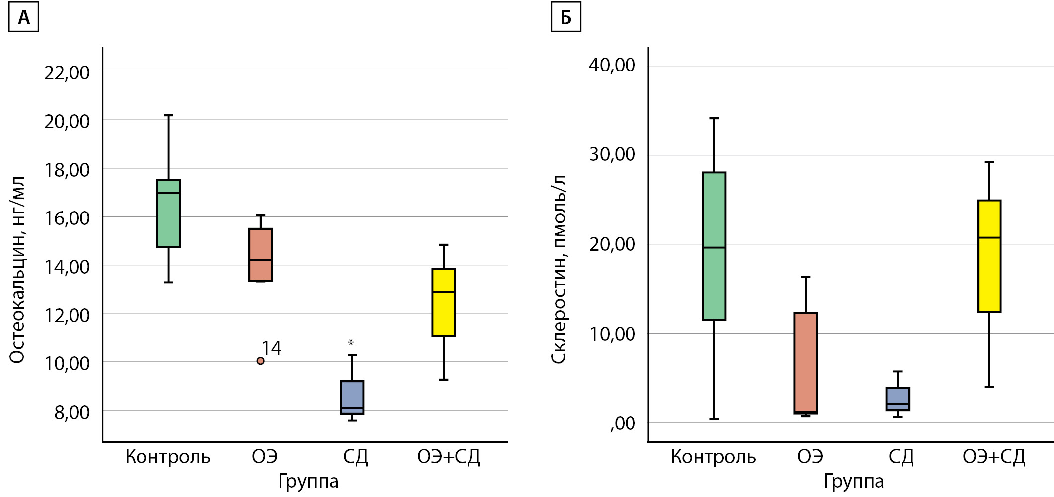 При сравнении животных с СД (без ОЭ) с группой контроля выявлено значимое снижение остеокальцина, что подтверждает замедление костного ремоделирования при СД. При сочетании ОЭ и СД данный эффект не проявился.