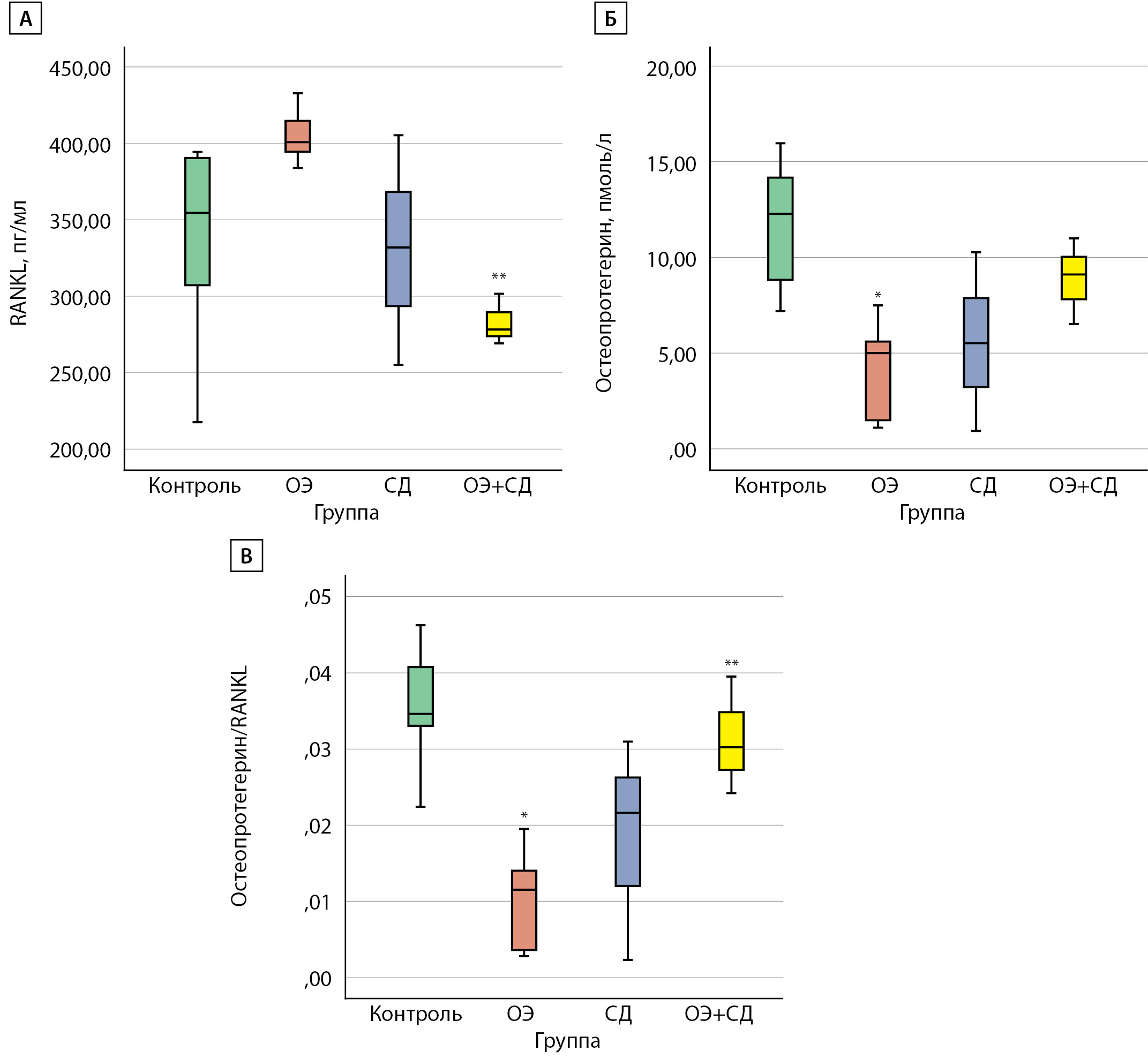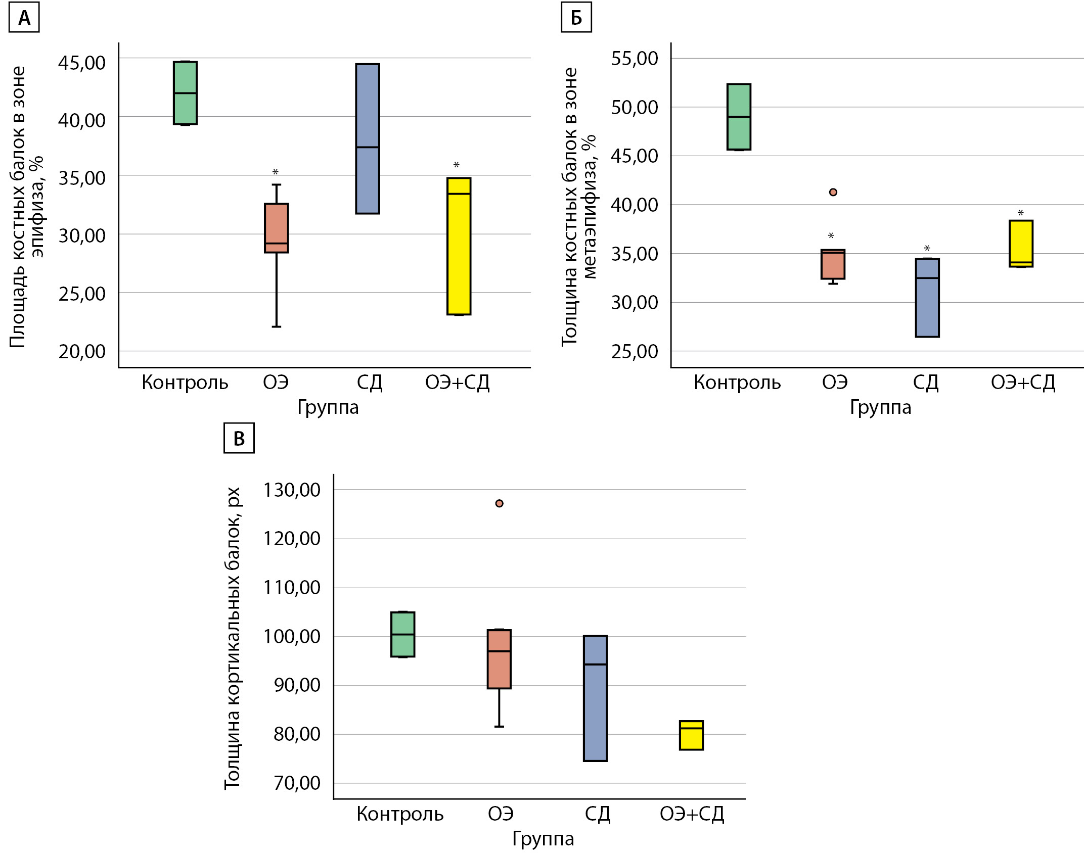 Результаты. Уровень фосфора был значимо ниже как в группе «ОЭ» (1,63 [1,58; 1,65] ммоль/л), так и в группе «СД» (2,81 [2,57; 2,83] ммоль/л) по сравнению с группой «Контроль» (3,12 [2,55; 3,24] ммоль/л), р<0,001. Данный показатель был значимо выше в группе «ОЭ+СД» (2,79 [2,46; 2,81] ммоль/л) по сравнению с группой «ОЭ» (2,79 [2,46; 2,81] ммоль/л), р=0,025. Уровень остеокальцина был достоверно ниже в группе «СД» (8,11 [7,84; 9,19] нг/мл) по сравнению с группой «Контроль» (16,97 [14,07; 17,07] нг/мл), р=0,005. Найдена слабая отрицательная корреляционная связь (r=-0,5; p<0,05 ) между уровнем глюкозы и уровнем остеокальцина. Выявлены более низкая концентрация RANKL в группе «ОЭ+СД» (278,1 [273,1; 289,7] пг/мл) по сравнению с группой «ОЭ» (400,6 [394,5; 415,1] пг/мл) и более высокое соотношение ОПГ/RANKL (0,03 [0,02; 0,04] и 0,01 [0,004; 0,014] соответственно), р=0,05. В группе «ОЭ» получен более низкий уровень ОПГ (5,1 [1,5; 5,6] пмоль/л) и соотношения ОПГ/RANKL (0,01 [0,003; 0,014]), чем в группе «Контроль» (12,3 [8,8; 14,2] пмоль/л и 0,34 [0,33; 0,4], р=0,025 и р=0,07 соответственно). Площадь костных балок в зоне эпифиза была наибольшей в группе «Контроль» (42 [39; 45]%), различия достоверны по сравнению с группой «ОЭ» (29 [25; 33]%, p=0,011) и группой «ОЭ+СД» (30 [23; 25]%, p=0,016). Площадь костных балок в зоне метаэпифиза также была наибольшей в группе «Контроль» (49 [46; 52]%) по сравнению с группами «ОЭ» (35 [25; 39]%), «СД» (31 [26; 34]%), «ОЭ+СД» (35 [33; 38]), p <0,001. В толщине костных балок различий между группами не было.