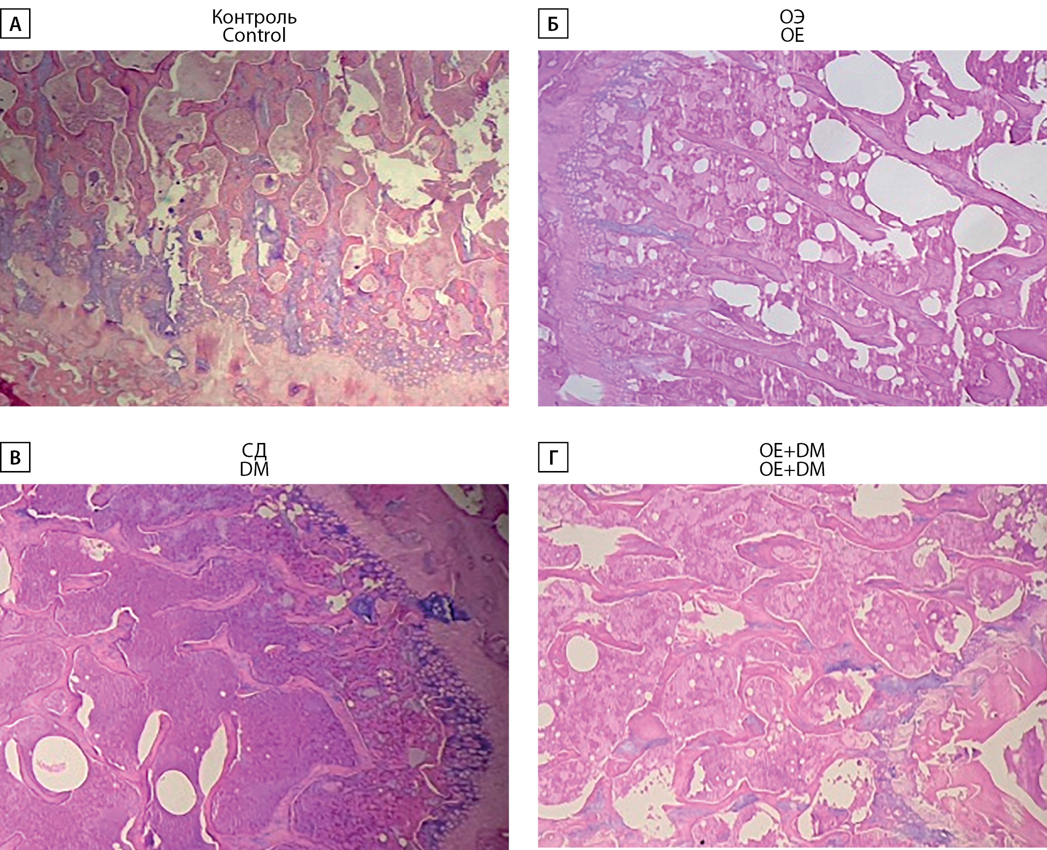 6. Рисунок 6. Эпифизарная область бедренной кости с костными балками крыс Wistar в группе «Контроль» (А), после овариэктомии (Б), с СД (В), после овариэктомии с СД (Г). Окраска гематоксилином-эозином, ув. ×100.