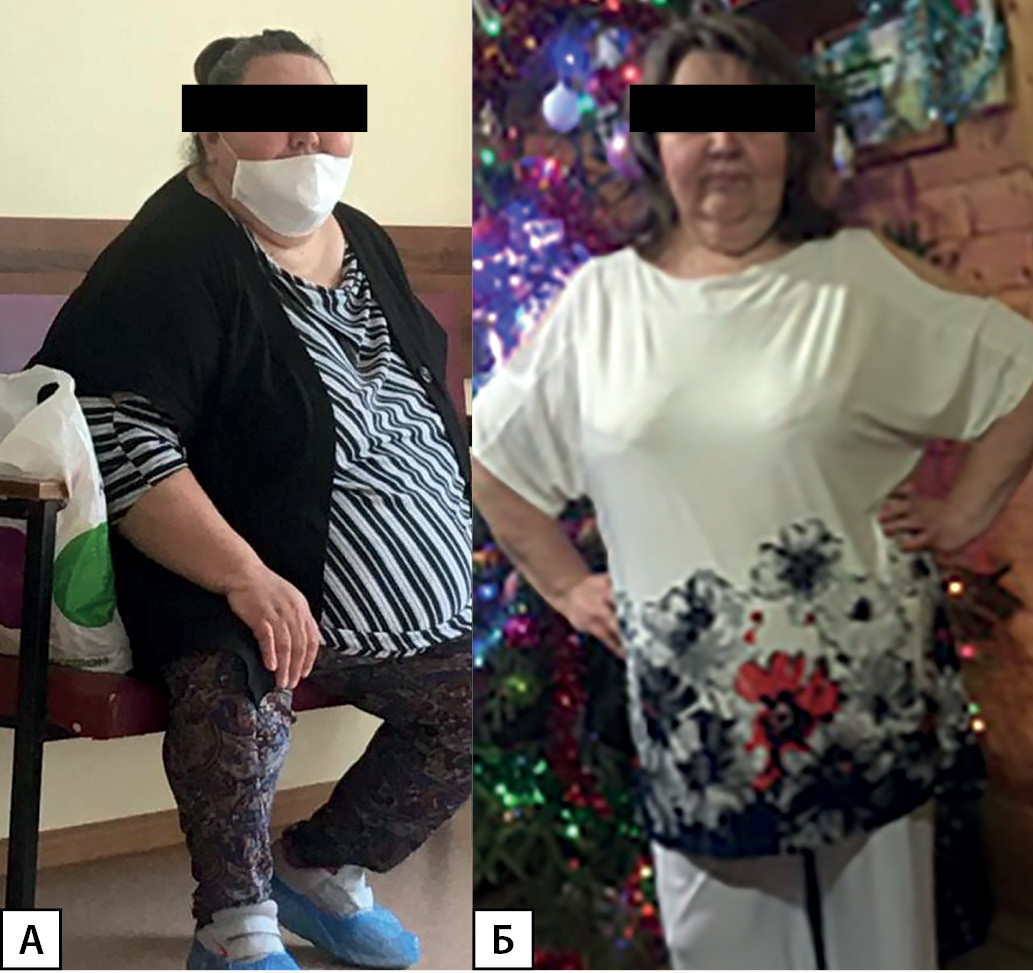 Пациентка консультирована бариатрическим хирургом, учитывая выраженное ожирение, неэффективность консервативных мероприятий по его лечению и развитие коморбидных ему заболеваний, в первую очередь СД2 со множественными осложнениями, пациентке было рекомендовано оперативное лечение в объеме лапароскопического шунтирования желудка, которое было проведено в июле 2020 г. на фоне предварительного снижения массы тела на 10–11 кг за счет соблюдения рекомендаций по питанию, достижения целевых показателей гликемии и АД. В послеоперационном периоде пациентка была проконсультирована диетологом, даны рекомендации по поэтапному расширению пищевого рациона, дополнительному приему поливитаминов, препаратов кальция и нативного витамина D под регулярным лабораторным контролем в установленные сроки наблюдения (1-й год — 1 раз в 3 мес, 2-й год — 1 раз в 6 мес, далее минимум ежегодно).