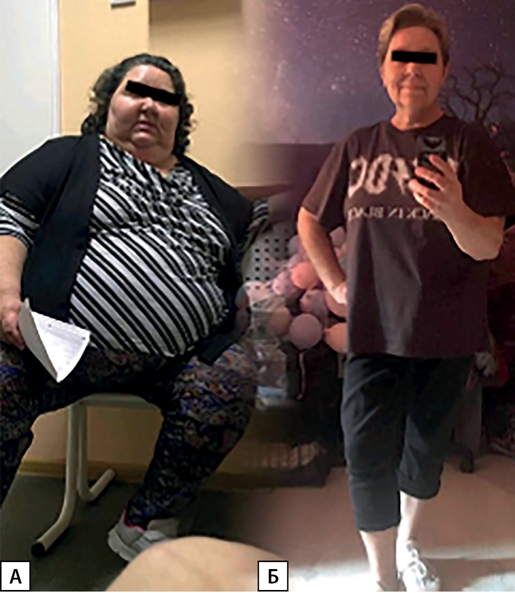 4. Рисунок 4. А. Пациентка М., до операции, вес 139 кг. Б. Пациентка М., через 1,5 года после гастрошунтирования, вес 69 кг | |