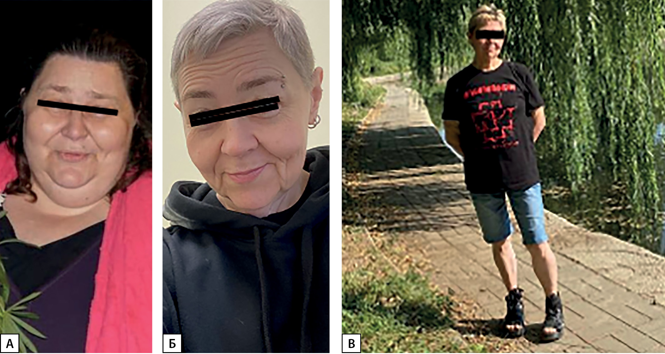 5. Рисунок 5. А. Пациентка М., до операции, вес 139 кг. Б, В. Пациентка М., через 2 года после гастрошунтирования, вес 63,5 кг | |