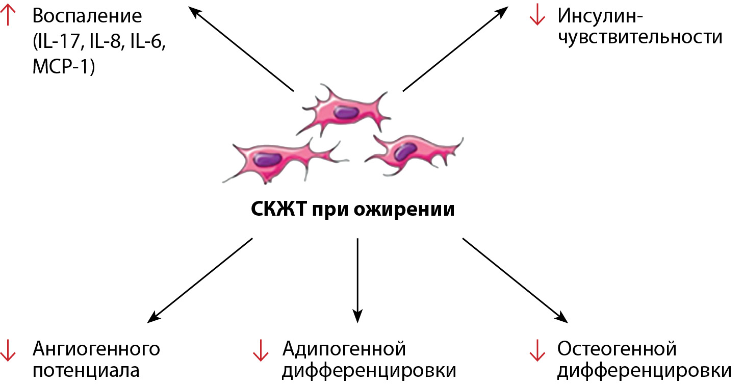 В совокупности эти данные показывают, что ожирение и другие иммунные метаболические патологии нарушают функциональность СКЖТ, способствуя провоспалительному ответу. Воспаление, в свою очередь, ухудшает адипогенную способность СКЖТ, это может снижать способность генерировать новые адипоциты в различных депо ЖТ, что в конечном итоге приводит к эктопическому накоплению жира. В целом данные большого количества исследований показывают, что СКЖТ являются ключевыми регуляторами иммунного ответа при ожирении.