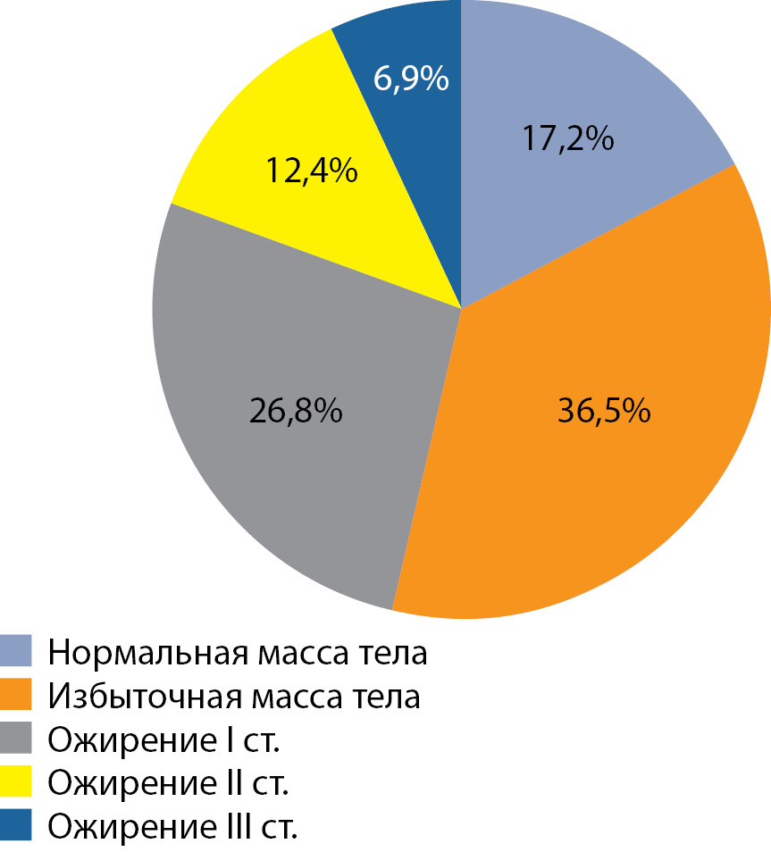 Большинство обследованных пациенток имели избыточную массу тела (36,5%) и ожирение I степени (26,8%), ожирение II степени выявлено у 12,4%, ожирение III степени — у 6,9% (рис. 1).