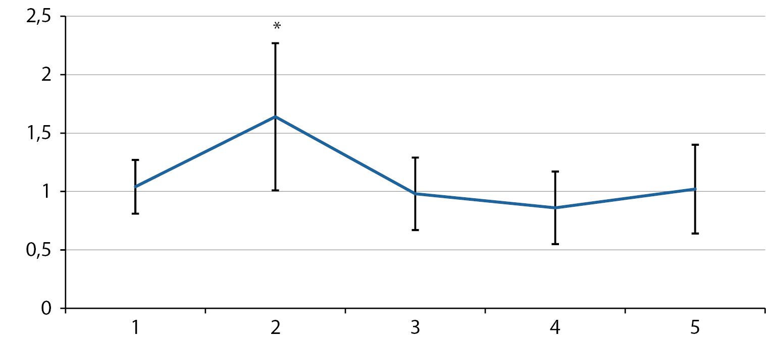 Note. 1 gr. — control, 2 gr. — HCHDR, 3 gr. — HCHDR + CAR, 4 — HCHDR + ALA, 5 gr. — HCHDR with CAR+ ALA complex. * — statistically significant difference from the control group (p<0,05). The minimum and maximum obtained values are presented as spreads.