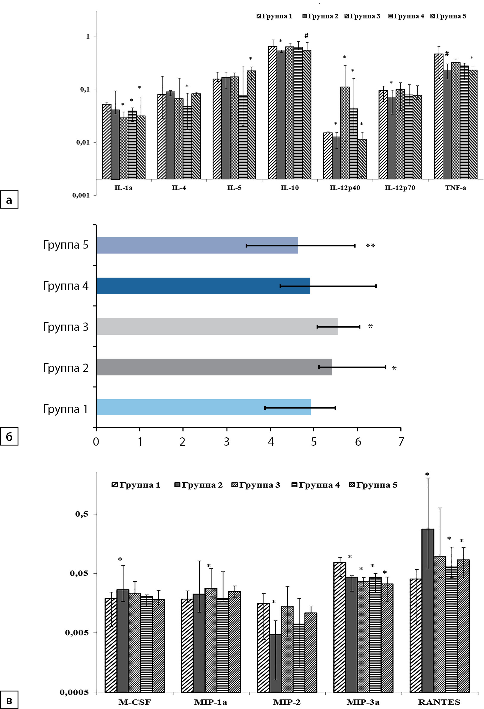 * — различия между контролем и опытными группами p<0,05; # — различия на уровне тенденции 0,05<p<0,1; ** — на рис. 2б различия между 2-й и 5-й группами p<0,05.