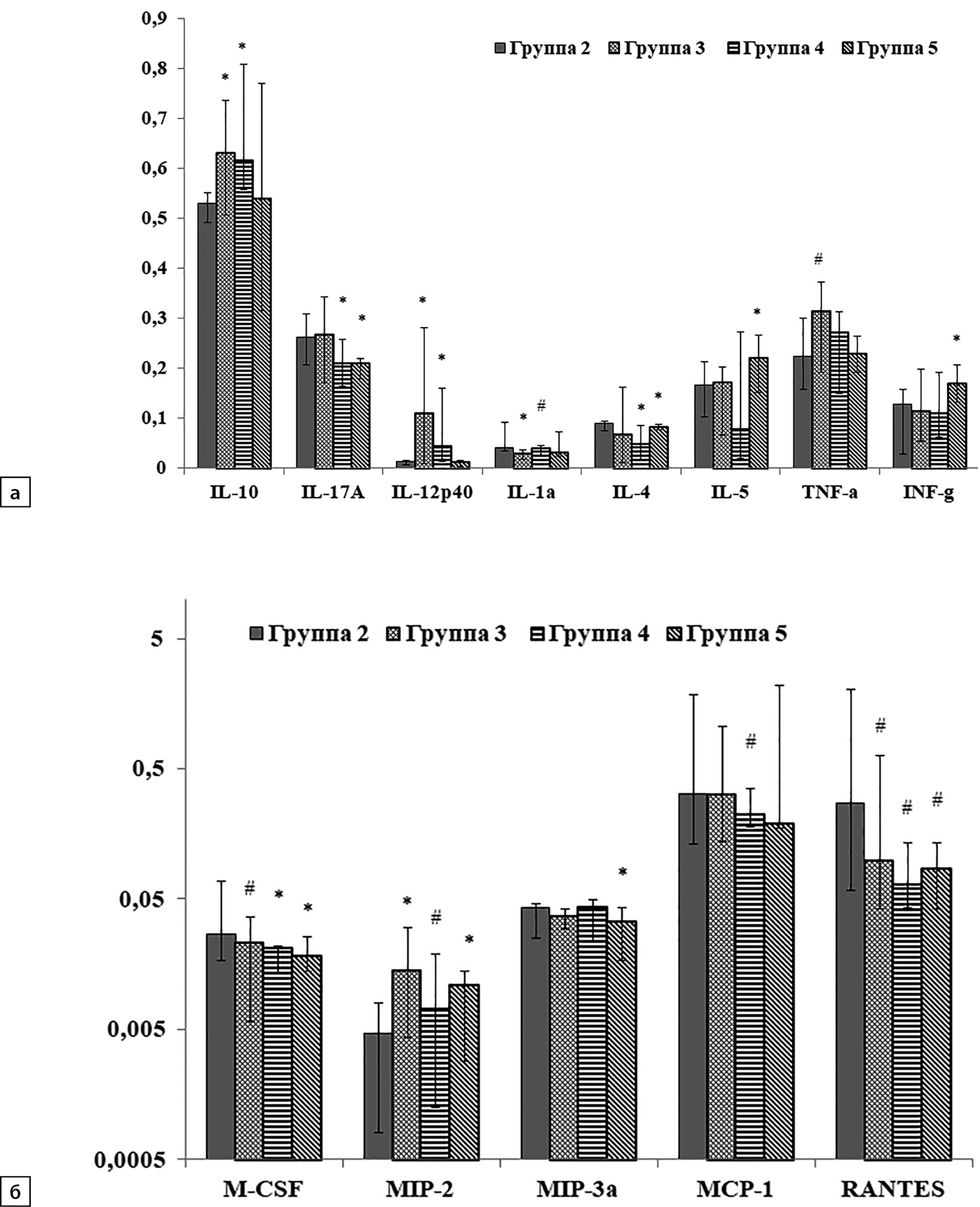 Рисунок 3. Содержание цитокинов и хемокинов в коре лобной доли левого полушария головного мозга крыс опытных групп по сравнению со 2-й группой: а — содержание цитокинов: IL — интерлейкин; TNF-a — фактор некроза опухолей альфа; IFN-γ — интерферон гамма; по оси Y содержание цитокинов (пг/мл); б — содержание хемокинов: CSF — колониестимулирующие факторы; MIP-макрофагальные белки воспаления; RANTES- экспрессируемый и секретируемый T-клетками при активации хемокин; MCP-1 — моноцитарный хемоаттрактантный белок; по оси Y — содержание хемокинов (пг/мл).