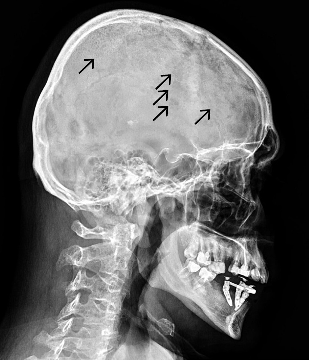 1. Рисунок 1. Рентгенограмма черепа в боковой проекции пациента Я. Стрелками обозначены очаги остеолизиса — симптом «дырявого черепа».