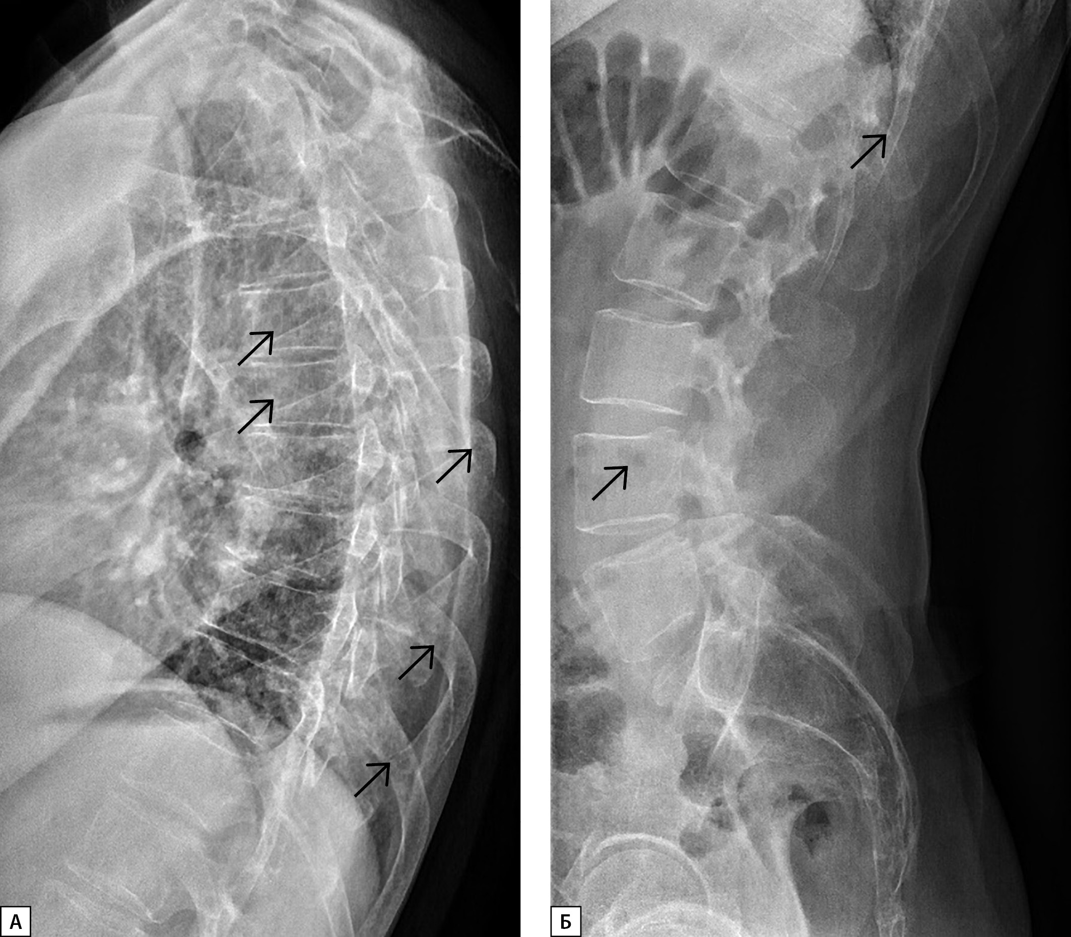 2. Рисунок 2. Рентгенограмма грудного (А) и поясничного (Б) отделов позвоночника в боковой проекции пациента Я. Стрелками указаны очаги литической деструкции в телах позвонков, в ребрах, особенно в их задних отрезках, в остистых отростках позвонков по типу «пчелиных сот».