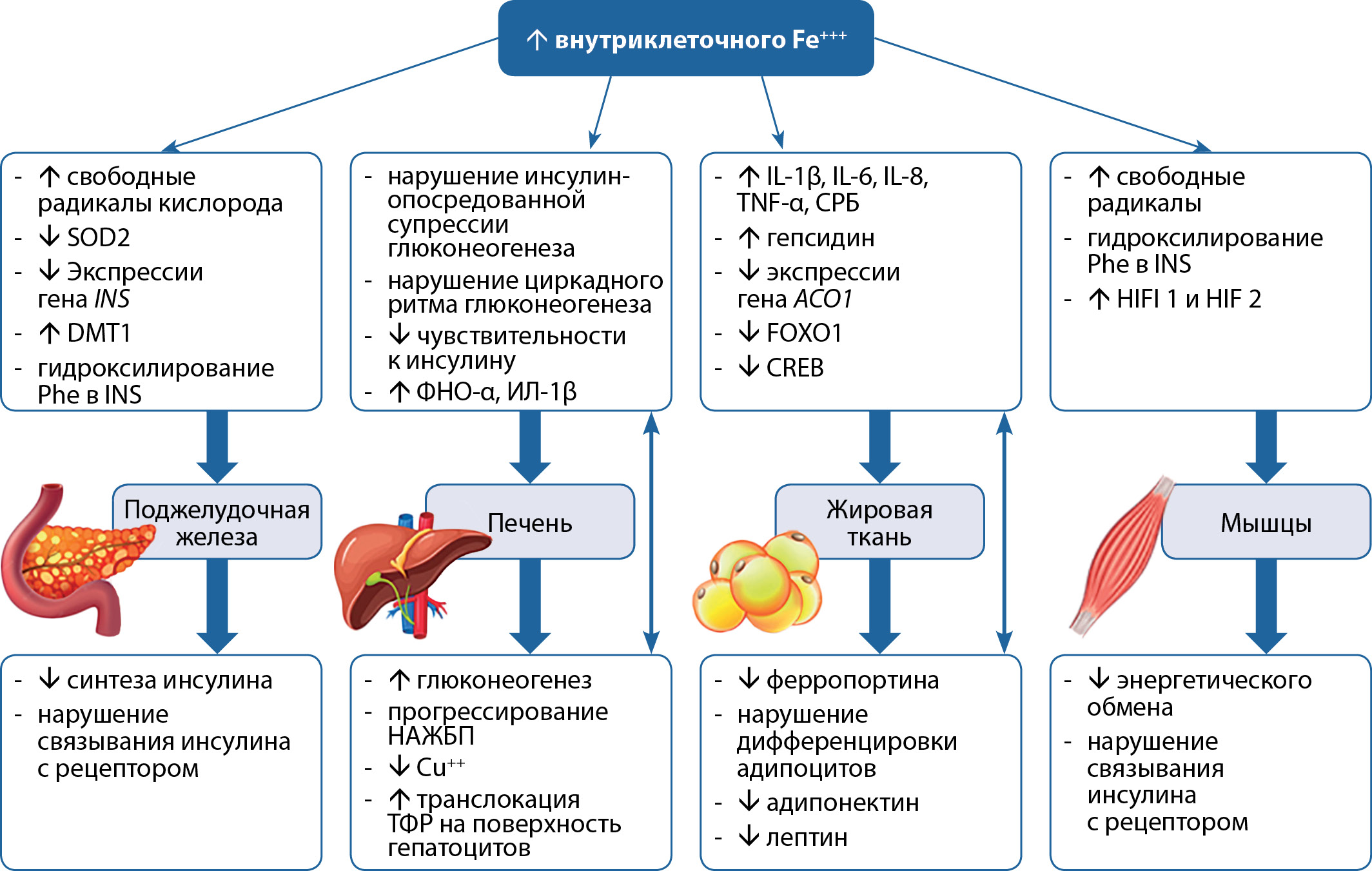 Железо оказывает влияние на формирование и клиническое течение таких хронических метаболических заболеваний, как ожирение, атеросклероз, неалкогольная жировая болезнь печени и сахарный диабет 2 типа. Высокая прооксидантная активность железа физиологически контролируется механизмами, регулирующими поступление, циркуляцию и потерю данного металла организмом. Эти механизмы включают взаимодействие железа с ферритином, трансферрином, гепсидином, инсулином, а также адипокинами и провоспалительными молекулами. Дисбаланс регулирующих обмен железа факторов приводит к развитию системного и паренхиматозного сидероза. Перегрузка железом обладает повреждающим эффектом в отношении основных тканей, участвующих в обмене липидов и глюкозы, — β-клеток поджелудочной железы, печени, мышечной и жировой тканей, а также в отношении органов, подверженных поражению в условиях хронической гипергликемии, — головного мозга, сетчатки и почек. Гиперферритинемия приводит к снижению секреции инсулина, формированию инсулинорезистентности и усилению глюконеогенеза в печени. Молекулярные механизмы данных эффектов железа разнообразны, и их изучение может способствовать ранней диагностике и профилактике нарушений углеводного обмена, а также расширению представлений о патогенезе других заболеваний, ассоциированных, как и сахарный диабет 2 типа, с питанием, старением и уровнем железа. В обзоре литературы приведены данные мировых исследований, посвященных взаимному влиянию метаболизма глюкозы и перегрузки железом, а также обсуждаются различия между наследственными и приобретенными нарушениями обмена железа с позиции их влияния на углеводный обмен.