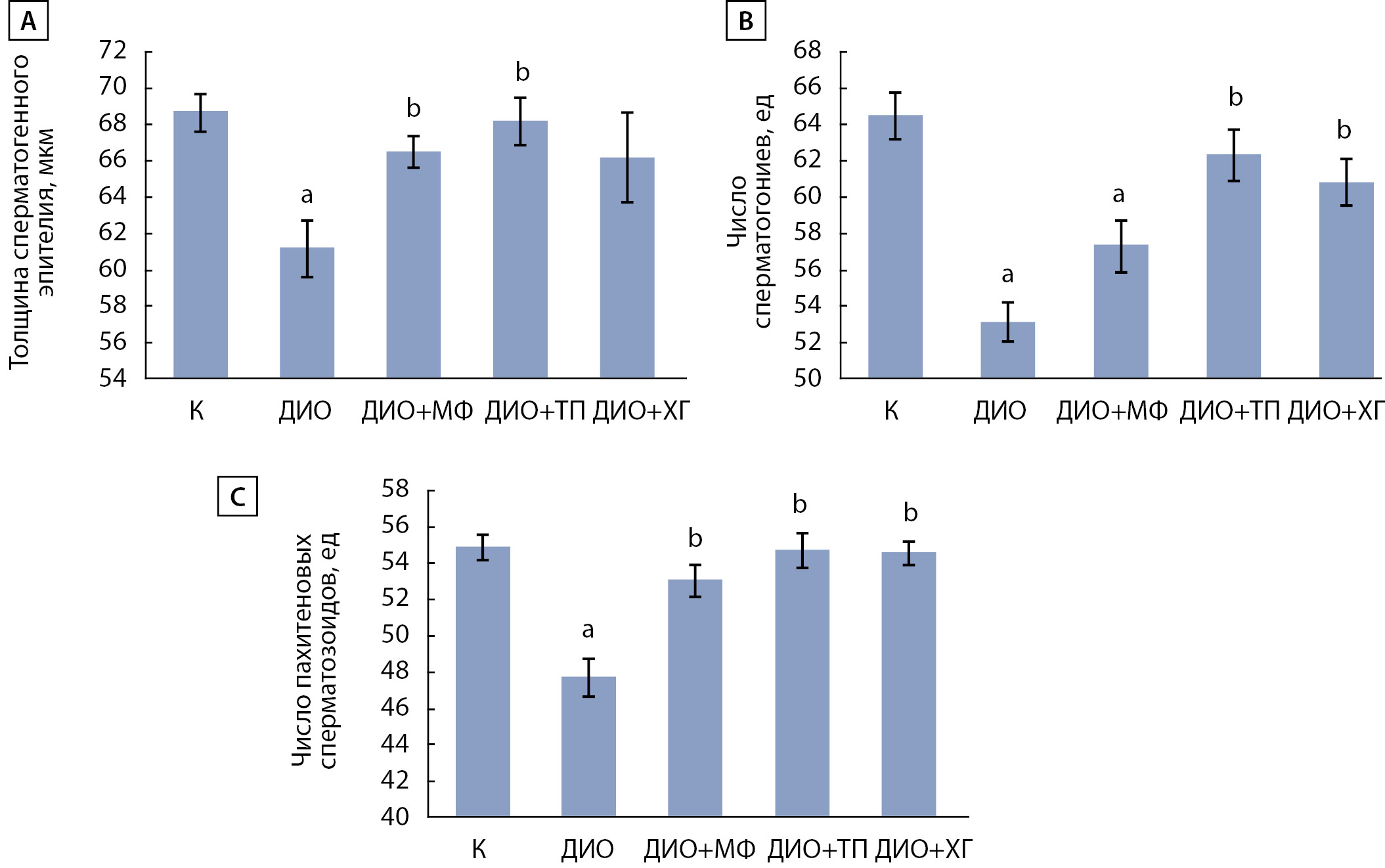 Материалы и методы. Ожирение у самцов крыс Wistar вызывали 23-недельной диетой, обогащенной насыщенными жирами. Обработку МФ проводили в течение 5 нед в дозе 120 мг/кг/сут (перорально), обработку ХГЧ и ТП03 — в течение 5 сут в суточных дозах 20 МЕ/крысу (п/к) и 15 мг/кг (в/б) соответственно. С помощью микроскопии и гистохимического анализа оценивали число и подвижность сперматозоидов (СП), число их дефектных форм и морфологию семенных канальцев, с помощью иммуноферментного анализа — уровни тестостерона и других гормонов в крови.